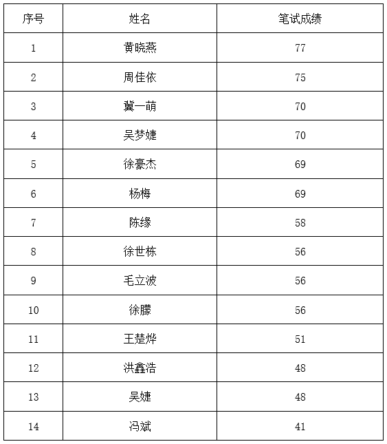 根据宁波新华书店集团有限公司用工招聘管理规定和本次集团财务部审计岗位招聘要求,对通过资格审查并参加了笔试的候选人员成绩进行公示。具体如下(按分数高低排列):