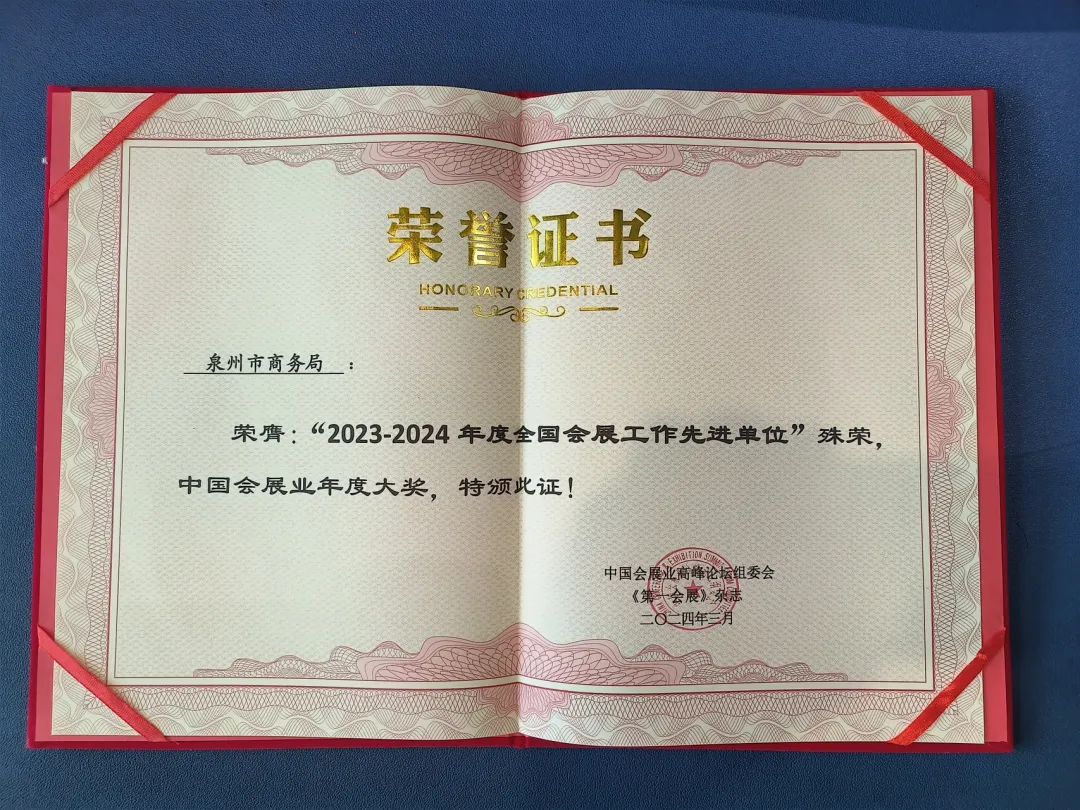 泉州市商务局获得“2023-2024年度全国会展工作先进单位”荣誉。