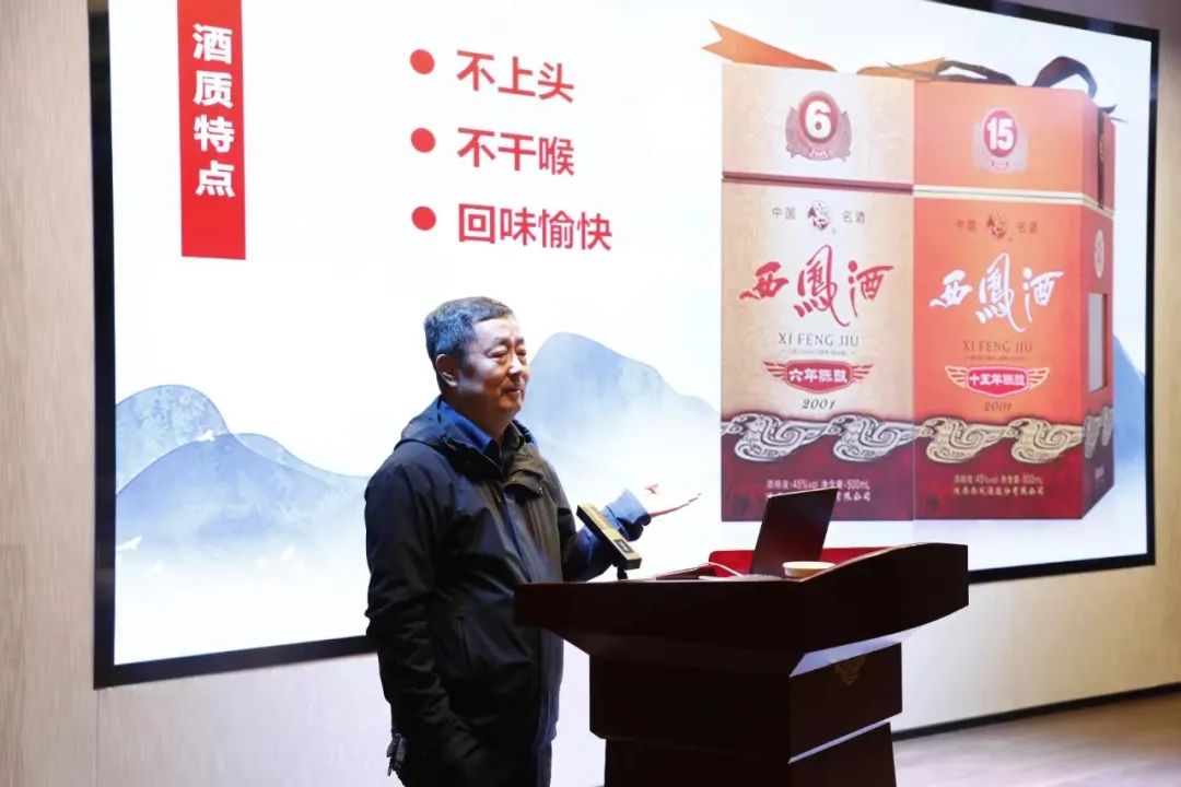 贾会长从凤香型白酒特点及工艺特征、酿酒原料、凤香型白酒制曲工艺、国宝级酒海储存等方面,全面讲解专业白酒知识。他特别强调任何一款白酒必须有自己的独特性,他特别从西凤酒15年6年陈酿品牌的独特性、酒质特点、感官特点、品质特点、西凤酒的勾兑品评方法、西凤酒的酒体风味特点及品评要点等进行阐述,进一步提升全员白酒文化鉴赏及品评专业知识。