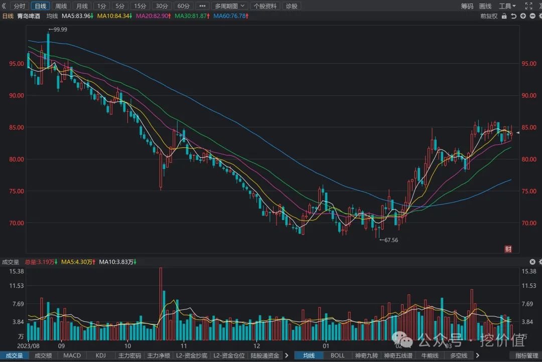 2024年3月5日更新:从今日K线图分析,当前股价日K线图形态中线看空修正为偏多,短线从中性修正为看多,短线股价已经有效站稳20日均线,预计短期内股价跟随大盘指数反弹的概率较高,但上涨空间可能受到限制。此股不适合以业绩估值,首次引入中线股价波动区间68元-102元。短线股价再次跌破前一个最低价67.56元的概率极低,预计中期股价维持60日均线偏强波动的概率较高,当前股价位置最佳交易策略是逢低买入持有待涨,参考仓位占比不超过10%,短线交易逢低买入,参考买入价78元左右,仓位5%,如果股价下跌至60日均线附近可把仓位提升至10%,可不预设止损价,但短期内盈利空间有限。当前股价81元,维持中线谨慎持有策略,预计未来半年,股价跑赢大盘指数和板块指数。青岛啤酒维持啤酒行业首选。