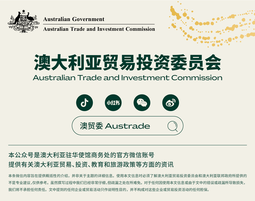 请持续关注澳贸委的官方微信“Austrade澳贸委”,了解行业最新动态、相关活动以及与澳大利亚优质产品的合作机会!