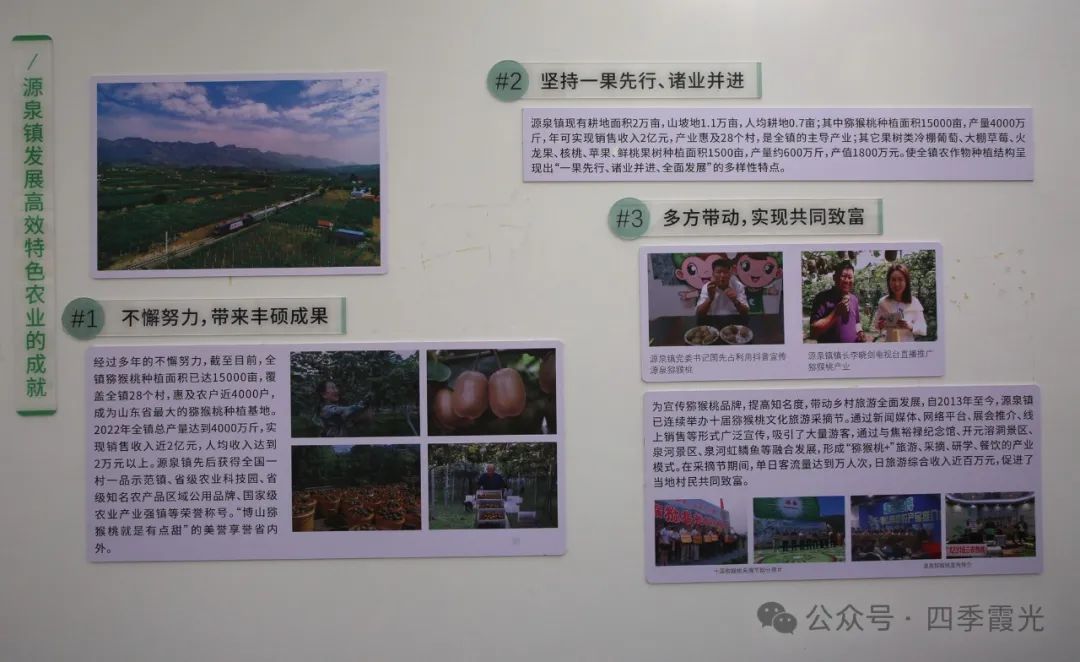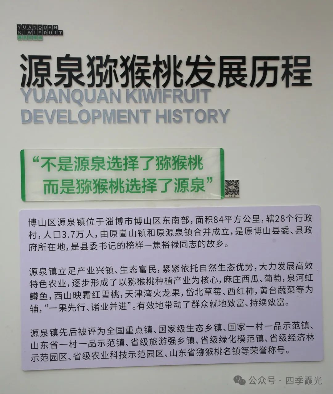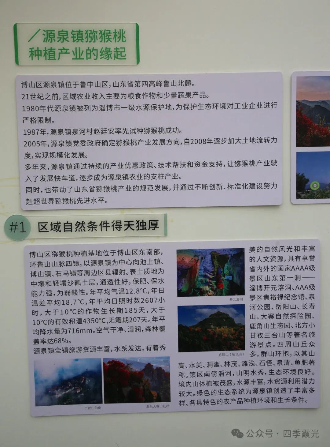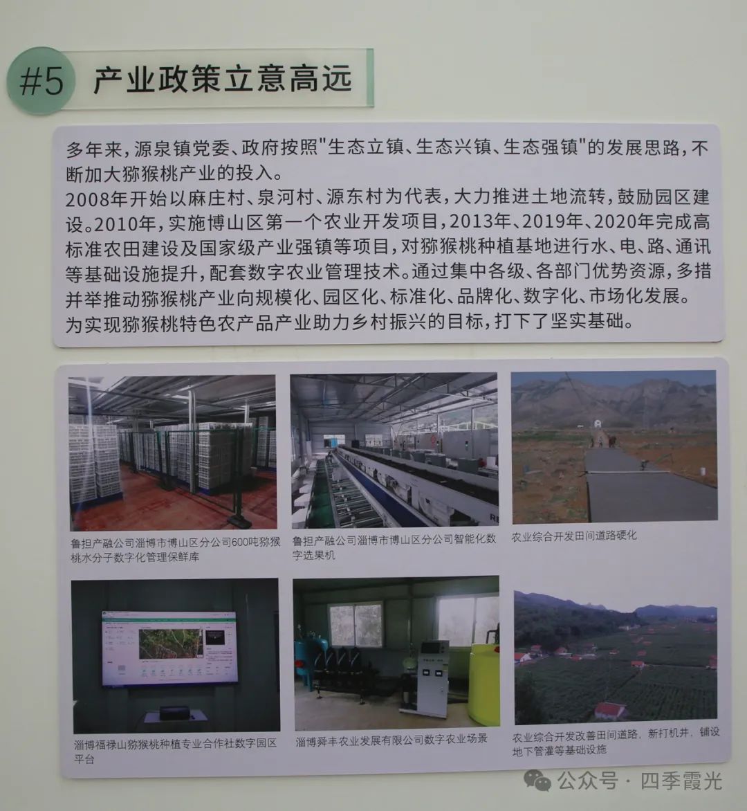 博山区源泉镇位于鲁中山区,山东省第四高峰鲁山北麓。21世纪之前,区域农业收入主要为粮食作物和少量蔬果产品。1980年源泉镇被列为淄博市一级水源保护地,为保护生态环境对工业企业进行严格限制。1987年,源泉镇泉河村赵廷安率先试种猕猴桃成功。2005年,源泉镇党委政府确定猕猴桃产业发展方向,自2008年逐步加大土地流转力度,实现规模化发展。多年来,源泉镇通过持续的产业优惠政策、技术帮扶和资金支持,让猕猴桃产业驶入了发展快车道,逐步成为源泉镇农业的支柱产业。同时,也带动了山东省猕猴桃产业的规范发展,并通过不断创新、标准化建,设努力赶超世界猕猴桃先进水平。