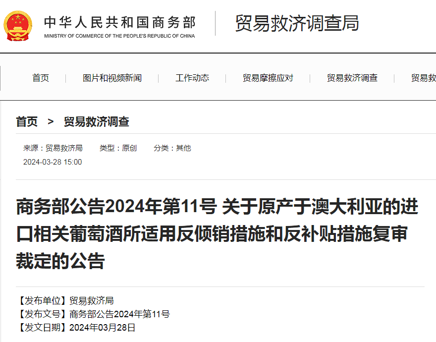 商务部公告2024年第11号,中华人民共和国商务部关于对原产于澳大利亚的进口相关葡萄酒征收反倾销税和反补贴税必要性的复审裁定,鉴于中国相关葡萄酒市场情况发生变化,对原产于澳大利亚的进口相关葡萄酒征收反倾销税和反补贴税已无必要。公告自2024年3月29日起执行。