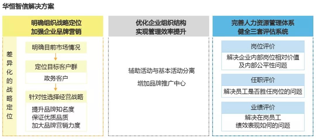 随着上述各类问题的出现和矛盾的凸显,企业方高层领导认为是企业内部管理出了问题,想通过咨询公司的帮助,解决企业难题。 华恒智信专家团队受邀来到企业,对企业目前存在的问题进行了管理诊断,经过对企业现状及问题的认真分析与研究,华恒智信专家团队透过现象分析问题的本质,认为目前企业首要解决的应该是经营问题,然后才是管理问题。对企业问题进行重新梳理后,主要归纳为以下几方面: ▲ 华恒智信——案例研究中心 首先,经营战略定位不明确,没有清晰的发展战略和竞争战略 白酒业正处在一个高强度竞争的市场营销领域里,尤其是中、低档白酒产品的竞争更为激烈。目前该酒业公司以生产中高档白酒为主,产品目标定位政务客户群。但是在实际运营过程中,企业却不能针对目标客户群,选择合适的竞争战略,在激烈的竞争中表现出后劲不足,企业核心竞争力减退。 从企业战略定位角度来看,根据企业生产经营的产品特点,“品牌”应该是企业的第一资源,是其生存与发展的关键所在,但该企业在品牌宣传上却缺乏科学性与针对性。 其次,企业组织架构不能支持企业战略发展 企业组织架构的设置依然为传统模式,主要设置生产、营销两大职能,没有单独设置品牌推广的部门,忽视了品牌对企业的重要性。现有的组织结构不能与组织战略有效的结合,组织结构不能为组织战略服务,反而阻碍了企业的进一步发展壮大。 第三,人员管理不能与企业发展需求相匹配 企业由原来的以生产为主逐渐向以市场为主过渡的过程中,更多的关注生产,不能根据企业战略的调整及时转变管理思路,管理不能与企业发展需求相匹配;其次,企业经营下的内部分工方式欠合理,由于企业经营班子团队在内部二次分工方面经验、能力的局限性,人员常常感觉分配不公平。 再次,作为一家集生产、销售为一体的酒业企业,专业的生产及销售人才缺乏,队伍综合素质不高,再加上缺乏对人员客观的评价,本来就稀缺的优秀人才流失严重,员工工作积极性普遍不高。传统的评估方式,单纯的强调人员业绩评价,忽视对人员能力的培养,容易使员工产生急功近利的心理,不利于企业长远目标的达成。