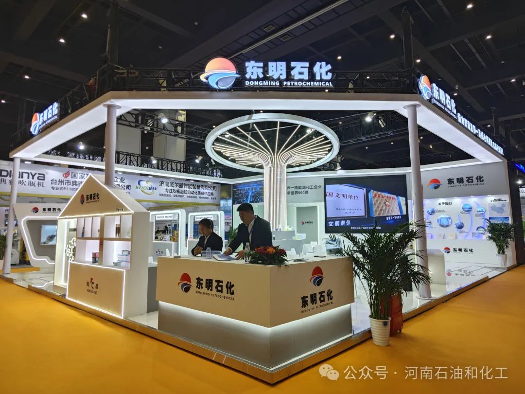 图为参展企业东明石化工作人员正在为即将开展前迎接参观人员做准备工作。
