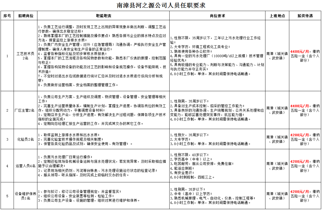 南漳县河之源污水处理有限公司招聘公告