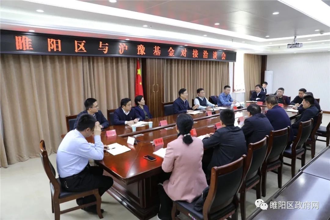 4月15日上午,睢阳区与河南沪豫基金管理有限公司对接洽谈会召开。区委书记栗朝举与河南沪豫基金管理有限公司总经理黄辉一行就项目合作事宜进行对接洽谈。区领导张岩、黄文杰、宋东谟出席会议,区财政局、区商务局、区教体局、区市政建设局、区交通局、区发改委、区金融服务中心、区住投公司、区发投公司、古城旅游公司、产业集聚区管委会办公室、生态食品产业园管委会办公室等单位负责同志参加会议。