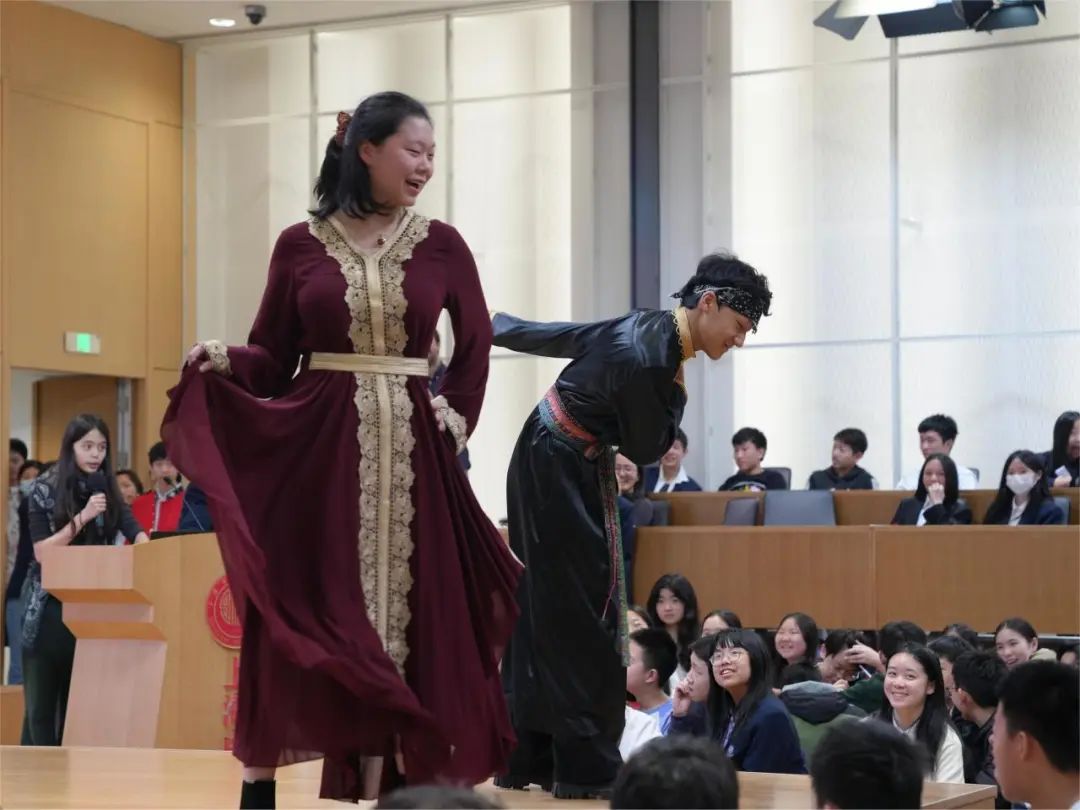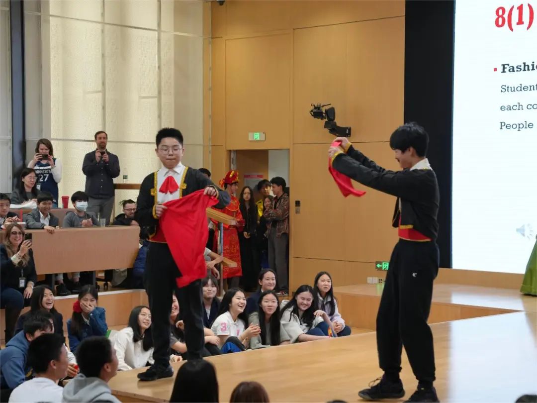 在四楼世界博览日海报旁的空地上,还上演了由同学们准备的精彩才艺表演,分别是萨克斯、小提琴和琵琶演奏。另外,在甄陶报告厅举行的服装秀也是本次世界博览日的一大看点。学生们穿上各国的传统服饰,在T台上展现多元文化的风采,富有创意地与当地传统文化产生了更紧密的联结。