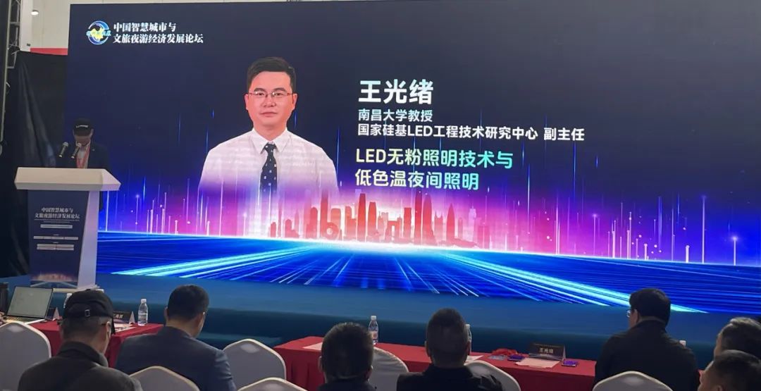 展会首日,“中国智慧城市与文旅夜游经济发展论坛”如期举行。南昌大学教授、国家硅基LED工程技术研究中心副主任、金黄光副董事长王光绪带来《LED无粉照明技术与低色温夜间照明》主题分享。王光绪副主任是入选教育部国家级青年人才,科技部国家重点领域创新团队核心成员。致力于具有高光效、高可靠性的硅基氮化镓LED芯片器件的技术创新与成果转化工作。金黄光LED无粉照明技术是以无荧光粉光源技术为核心竞争力,具有无荧光粉、强透雾性、高效节能、经济环保、零蓝光、低色温、不惹蚊虫等特性,为交通照明的节能性、安全性、舒适性提供有力保障。