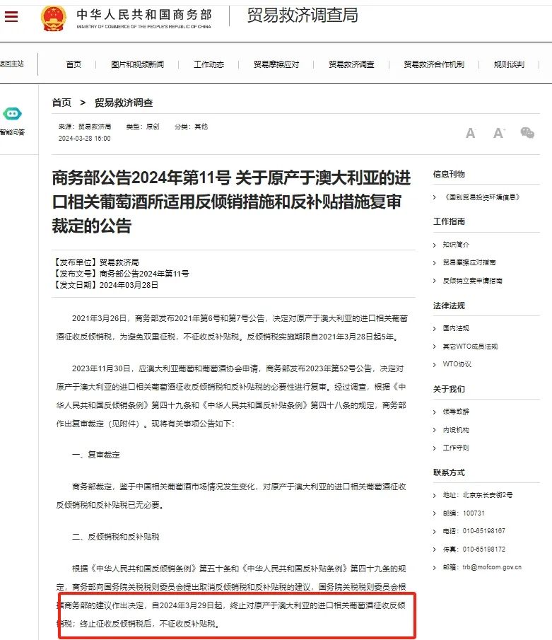 昨日,商务部发布消息,根据《中华人民共和国反倾销条例》第五十条和《中华人民共和国反补贴条例》第四十九条的规定,国务院关税税则委员会作出决定,自2024年3月29日起,终止对原产于澳大利亚的进口相关葡萄酒征收反倾销税;终止征收反倾销税后,不征收反补贴税。