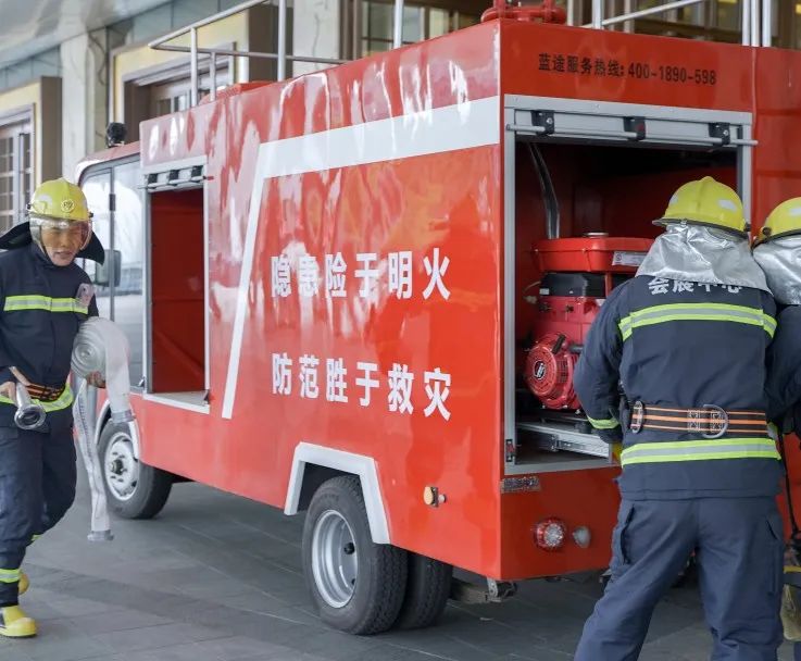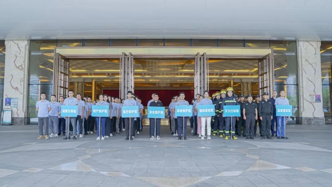 监控室收到火警反馈后拉动警报,指挥员指导疏散组和安全维护组等进行现场演练,全体人员根据指示从演练现场撤离到会展中心迎宾大厅正门区域。随后各小组组长快速整队核查人数,检查人员受伤情况,指挥员组织医疗救护组和通讯联络组对现场完成后续处理。随后根据现场情况指挥灭火行动组演示火灾的扑救,及时响应,使用现场消防设施进行灭火处理。