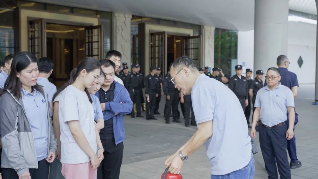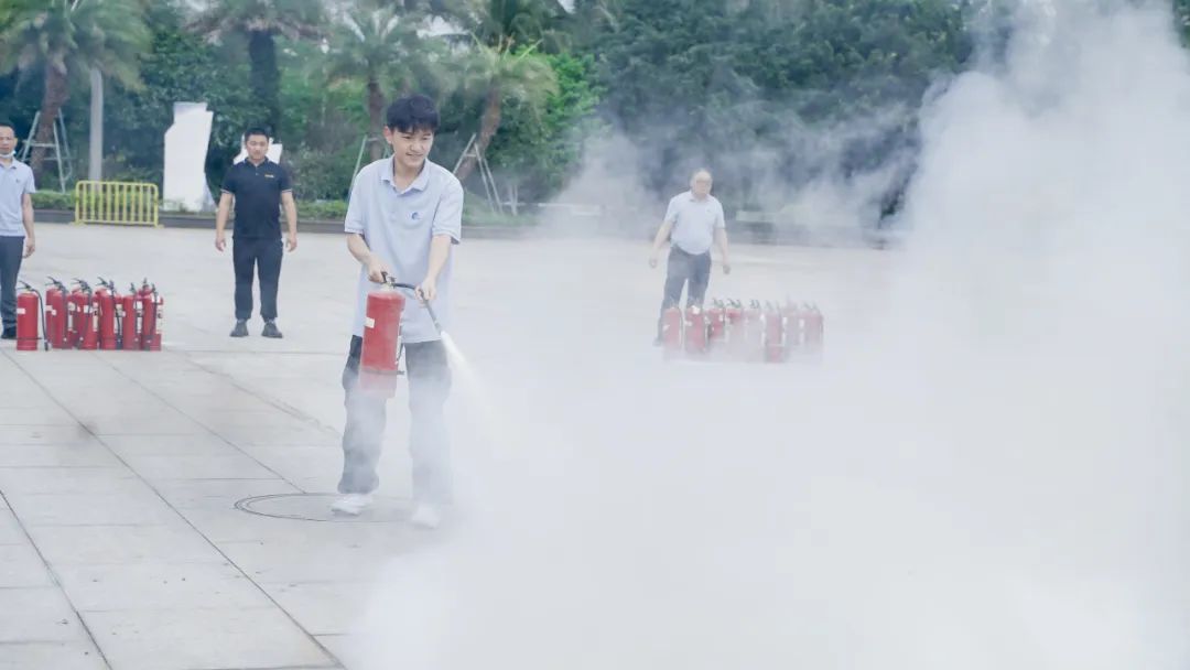 示范、讲解干粉灭火器的使用技巧和注意事项,组织全体人员轮流使用灭火器进行灭火实操练习。