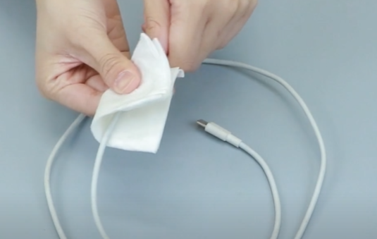 白酒的第三个妙用就是可以起到一个清洁的作用。准备一张纸巾,将白酒倒在上面,大家可以看到家里数据线要是因为使用时间太长,表面布满了污渍,非常的不美观。然后将沾了白酒的纸巾轻轻的擦拭数据线。大家可以发现数据线上面的灰尘污渍非常轻松地就被擦在了纸巾上面。
