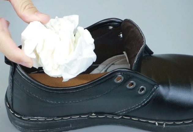 等白纸干透之后,我们将它团成团,然后将纸团塞进鞋子里面。纸团里面残留的酒精可以软化皮质,这样鞋子就不会夹脚啦。如果我们买回来的鞋子有夹脚的情况,就可以使用这个方法试一下哦。