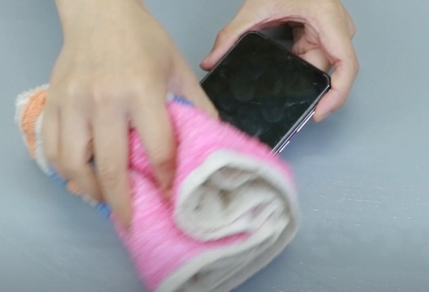然后用蘸了酒精的毛巾擦拭手机屏幕。因为白酒里面含有酒精,可以有效的去除手机屏幕表面的污渍,还可以为我们的手机屏幕起到一层保护膜的作用。大家可以清晰的看到手机屏幕经过擦拭之后变得非常的干净啦,你也赶快给自己的手机试一下吧。