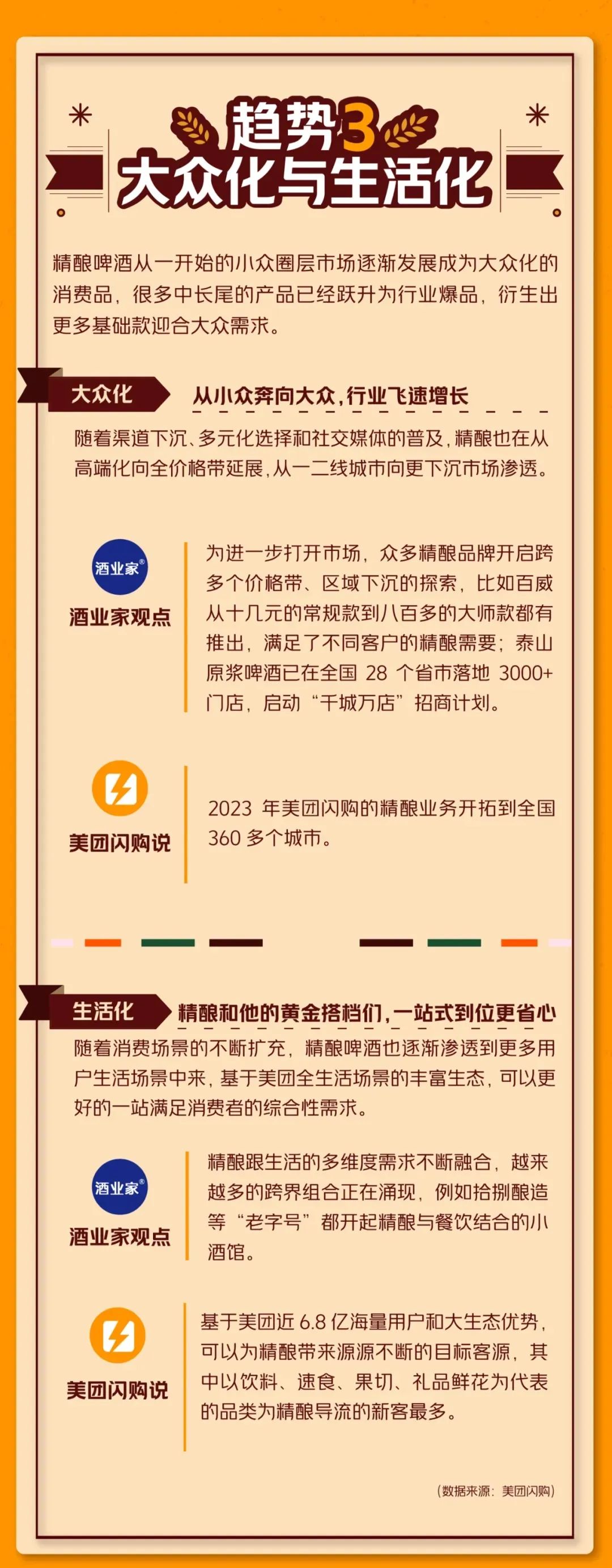 趋势3:大众化与生活化,下沉趋势助力构建良性生态。精酿啤酒的消费热潮持续下沉,也激发了更多商家开发中端、大众款精酿啤酒的动作。美团闪购数据显示,2023年美团闪购的精酿业务开拓到全国360多个城市,订单数据表现稳步向好。产业链上下游持续完善,也为商家构建良性消费生态,激活更多消费可能提供了全新机遇。趋势4:速度与激情,解锁优质体验的两大关键。精酿需求呈现显著“非满足即消失”的特点,激情需要速度来满足。精酿啤酒的最佳饮用温度是10-15度,只有在商品保温保鲜的时间内将酒品送达至消费者手中,才能确保最佳的用户体验。以美团闪购“精酿荟”打标池的商家为例,从过往的订单看,平均25分钟内即可送达。另一方面,激情是精酿啤酒所承载的情绪价值,酒饮是消费者满足、释放情绪的中介,因而从情绪入手,通过营销策略激发消费者的情感共鸣,提升用户在消费过程中的复合体验,是商家调动消费者情绪,激发购买意愿的利器。美团闪购酒水业务负责人在2024年度精酿啤酒品牌论坛上透露:2023年,美团闪购精酿啤酒销售额增长是啤酒的2倍,整体精酿啤酒的用户搜索量同比增长180%。对商家来说,即时零售平台则为精酿啤酒的“破圈”提供了更多确定性机会。以泰山原浆与美团闪购的合作为例,泰山原浆入驻美团闪购以来,上线门店数量超过3000家,销售额增速连续三年超过100%。来源:电商报 原文作者:刘峰 转自链接:https://www.dsb.cn/242103.html