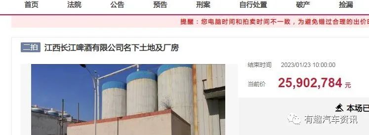 1月23日,大年初二,江西长江啤酒有限公司名下土地及厂房再次迎来第二次拍卖的日子,这次起拍价降到了2590.2784万元,比第一次少了六百多万元。最终,拍卖只有一个人报名竞拍,最后也是以起拍价的价格拍下了江西长江啤酒有限公司名下土地及厂房。