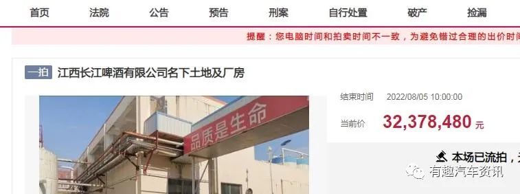 说到江西长江啤酒厂,估计不少江西人会喝过其生产的啤酒,比如"赣北牌"、"庐山秀峰牌"啤酒,就是其生产的。但是这个啤酒厂的厂房早在去年的时候,就被法院以3237.848万元给拍卖了,只不过最终流拍了。而江西长江啤酒有限公司现在也已经被列为失信人了。