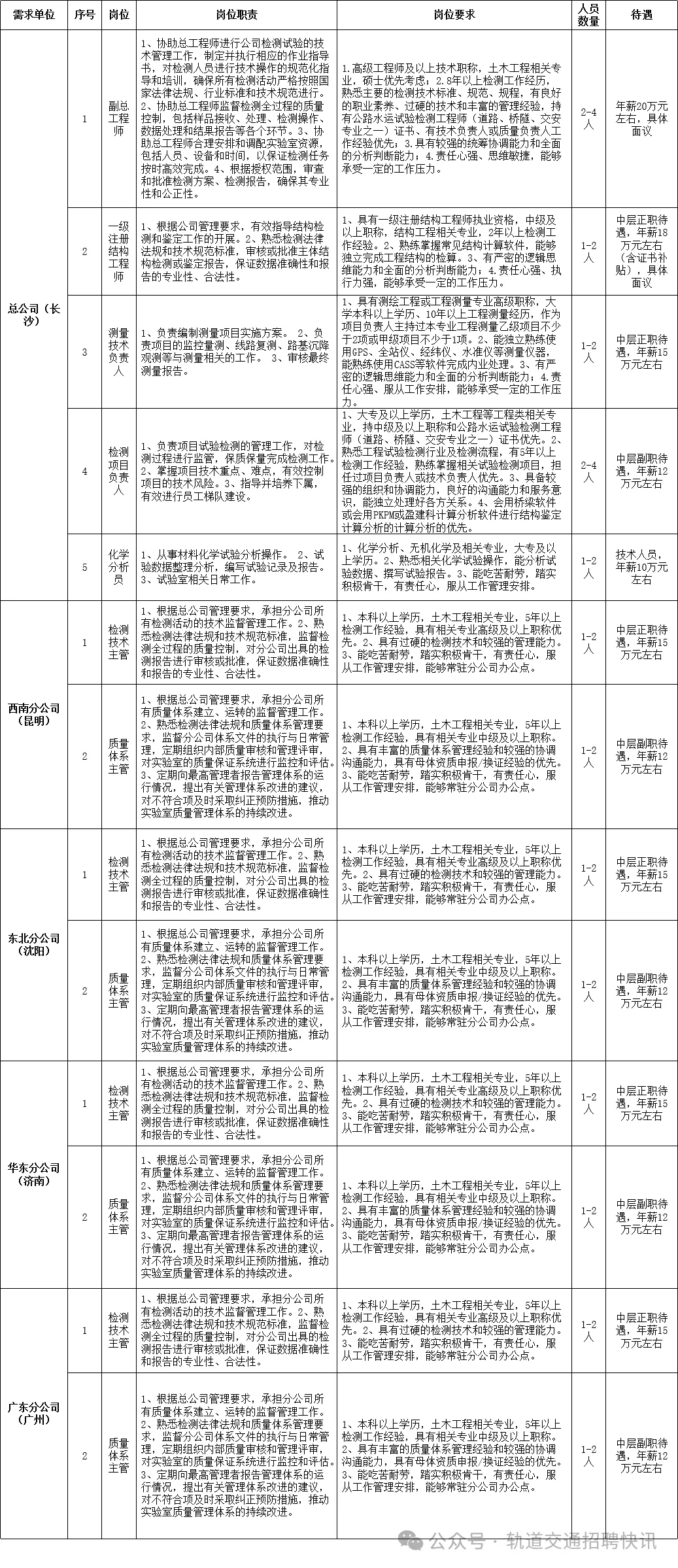 按国家规定政策签订劳动合同,缴纳社会保险、住房公积金、绩效奖金、年终奖、节日福利、定期体检及丰富多彩的文化活动。录用人员薪资待遇面议。1.下载并填写《高铁科技(湖南)有限公司招聘报名表》,需严格按照报名表填写简历;2.应聘者请于2024年4月9日前将《简历表》发至gtkjhn@163.com,邮件主题及附件名称务必注明“应聘岗位-姓名-最终学历-毕业学校”;3.应聘者需严格按照以上要求填写简历,否则不予接收;4.收到简历后,我们将以电话或短信形式通知您面试时间及安排。1.发布信息-报名-面试考核-深度沟通-意向人员谈薪-背景调查-体检-录用。2.本次招聘采取网上报名方式,根据岗位条件要求,每人限报2个岗位,报名信息发送到指定邮箱。联系地址:长沙市天心区韶山南路22号中南大学铁道学院高速铁路建造技术国家工程研究中心1.参加报名人员应认真填写报名材料,如与实际情况不符,一经查实,取消录用资格。2.上岗后如若发现已录用人员有个人档案材料、报名材料不实或其他弄虚作假行为等情况之一的,一律取消录用资格,解除劳动合同。高铁科技(湖南)有限公司招聘报名表(http://www.hnrcsc.com/#/positionB/consultdetailss?termTaxonomyId=70&id=1001411)