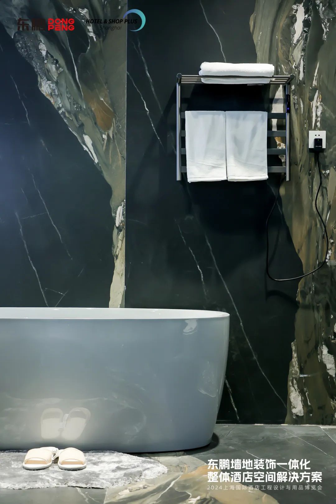此次参展,东鹏携瓷砖、整装卫浴、生态新材、innoci艺耐卫浴、意大利FLORIM、东鹏墙板等子品牌,集中展示其岩板、生态石、卫浴、石墨烯智暖岩板、墙板等一系列具备创新性、美观性、实用性的酒店工程专业装饰材料,并融合现代元素与古典风格,以摩登轻奢风与新中式轻奢风打造格调高雅、时尚简约的酒店空间,吸引大量海内外客户驻足参观与交流。