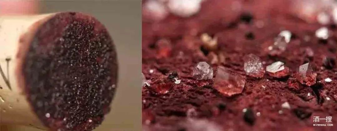 酒石酸沉淀是最常见的沉淀,通常会出现在软木塞上或瓶子的底部。红葡萄酒中的酒石酸沉淀多为暗红色的晶体,而白葡萄酒中则是无色或淡黄色的结晶。