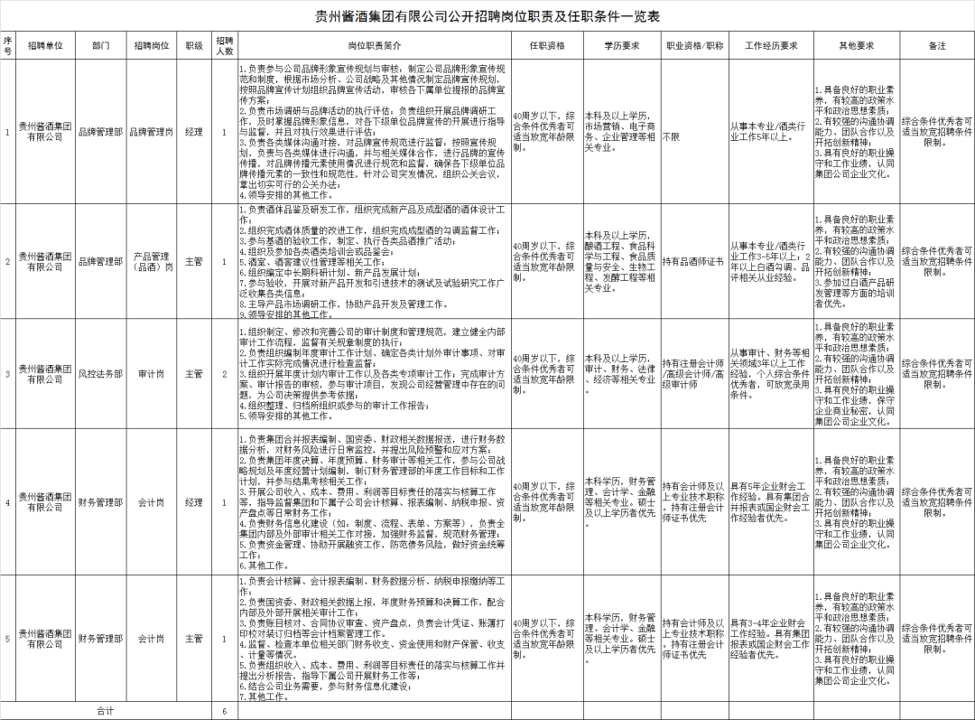 本次面向社会公开招聘6名工作人员,具体招聘岗位及要求详见附件《贵州酱酒集团有限公司公开招聘岗位职责及任职条件一览表》(见附件1)。任职条件计算年龄、工作年限、任职年限或取得专业技术职称时间计算日截止到本人报名时间。