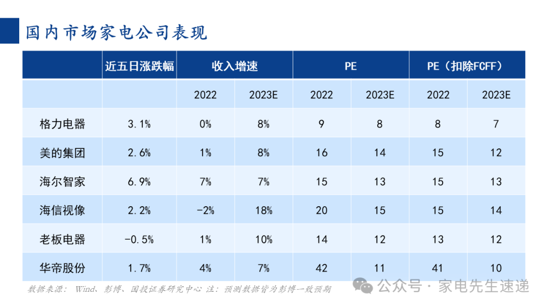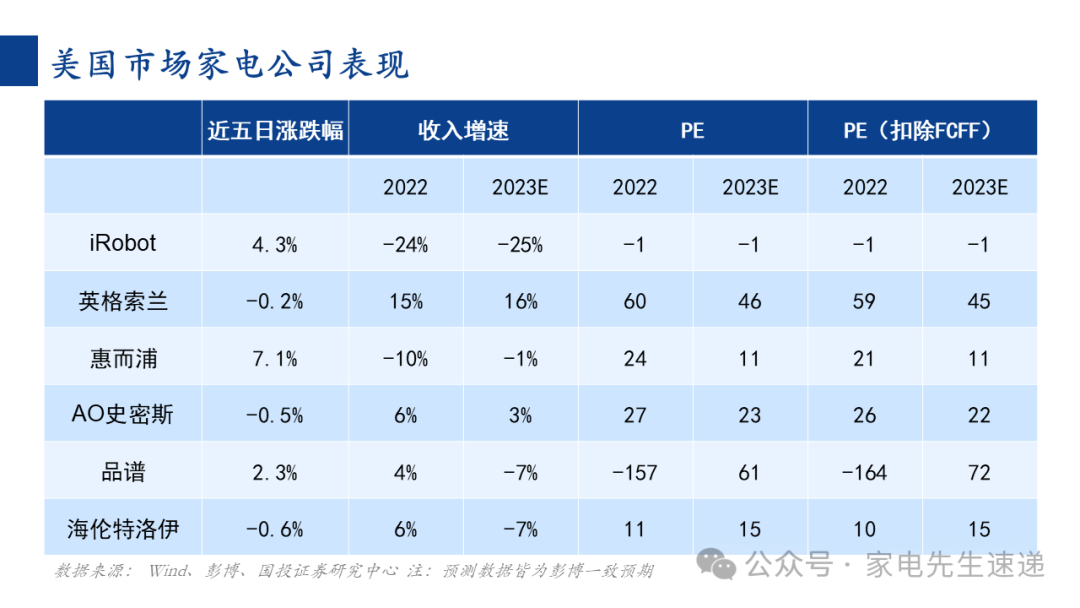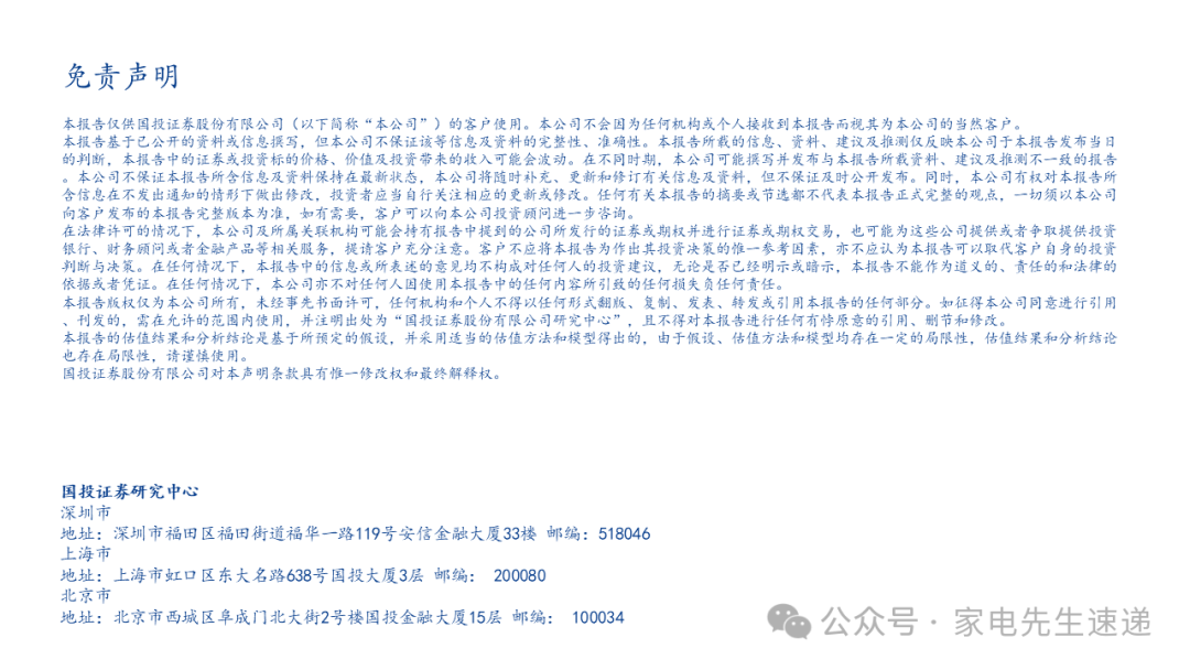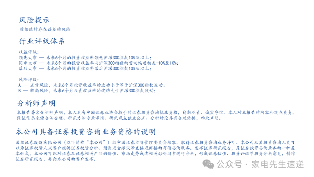 本订阅号为国投证券研究中心家电团队的个人订阅号。本订阅号推送内容仅供专业投资者参考。为避免订阅号推送内容的风险等级与您的风险承受能力不匹配,若您并非专业投资者,请勿使用本信息。本信息作者所在单位不会因为任何机构或个人订阅本订阅号或者收到、阅读本订阅号推送内容而视为公司的当然客户。