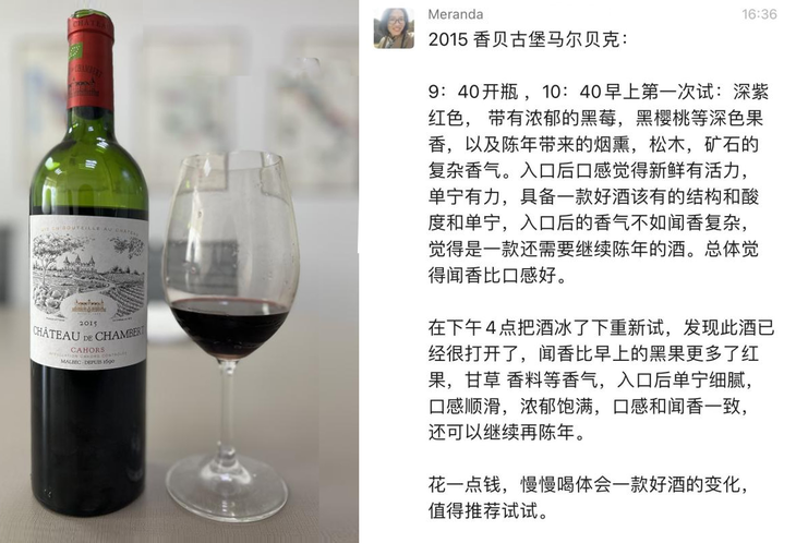 结果,他们一喝,就不太喜欢,觉得“香气不如喝起来好,水水的”,而我因为有点事,酒倒入杯子里一直没喝,等到我喝的时候,我惊讶了,入口的瞬间它浓郁的黑果味、烟熏味冲击着我,酒体饱满平衡集中,可以看出它的质地是属于好酒级别,有夸张到“水水的”吗?然后就大声说:“没有啊,你们再试试”。几个小时后,大家都被惊喜到了,包括我。原先我觉得它有点闷,但这次它的香气已完全打开,多了一些清新的红果风味,也带点花香,口感更为奔放开放,同时保持它原有的力量,偏强劲紧致、饱满浓郁,有比较好的结构骨架,尤其是酸度,很脆爽耐嚼,余味也可以,而且质地很顺滑。真是难得“打脸”的一次,也给了我们一次教训:不要急着否定一些酒,需要时间。没想到因为我的一次“误打误撞”救了一款酒啊~ 香贝庄:葡萄酒大师刘琳和丈夫的酒庄,法国西南部马尔贝克鼻祖;
