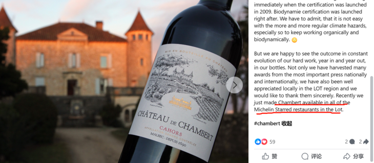 以下是 2015 年香贝庄马尔贝克干红(Chateau de Chambert Malbec Cahors)的详细介绍。 1、香贝庄:葡萄酒大师刘琳和丈夫的酒庄,法国西南部马尔贝克鼻祖直到查了资料,我才知道为何此酒会被说“很火”。葡萄酒大师刘琳是香贝庄的庄主夫人和酿酒顾问。刘琳,国内酒粉们可能很熟悉,中国近几年诞生的初位女性葡萄酒大师(Master of Wine),也是中国乃至亚洲少数能走向世界舞台的知名酒评家之一。MW 可以说是葡萄酒圈至高荣誉之一,全世界的 MW 也不过百来人,到中国更少了,所以刘琳的地位可想而知。香贝庄是法国西南部卡奥(Cahors)一座精品酒庄,与马尔贝克的渊源有 2,000 多年的历史,早在公元 10 世纪的时候就已开始种植,并于 13 世纪左右,葡萄园面积达到 300 多公顷,当时为一位大领主所有,后来多次易主,在 1690 年成为贵族资产,为皇室成员拉瓦莱特夫人(Madamoiselle Lalvalette)所有,后又易主 Latheze 家族。随着河航运的发展,香贝庄葡萄酒销往法国、英国、俄罗斯和美国各地,在 19 世纪的时候达到辉煌状态,尤其是该城堡出了位将军,更是名声响亮。酒庄年产 400 桶马尔贝克,并出口到整个欧洲和美国。在 2007 年,刘琳的丈夫菲利普(Philippe Lejeune)接手了该酒庄,与妻子携手进行了酒庄改革,先是转型有机农业,获得有机 Ecocert 认证,随后又转型生物动力法,获得 Demeter 和 Biodyvin 认证。这些年,香贝庄不仅获得了国内外 190 多个大赛奖牌,还得到了不少酒评家们的高分赞赏,尤其是《葡萄酒爱好者》(Wine Enthusiast),多次给予其 93、94 分好评。在《贝丹德梭葡萄酒年鉴 2015》(Bettane+Desseauve)中,香贝庄被评为“年度酒庄”,而在 2015 年度的《醇鉴》(Decanter)杂志中被评为“全球 50 大葡萄酒之一。”,近些年,香贝庄酒也进入了卡奥当地各大米其林餐厅酒单中。2、有机 + 生物动力法双认证,30 年以上老藤酿制这款酒,是香贝庄的招牌旗舰酒,也是获得高分奖牌无数的酒款。它产自酒庄精选的石灰岩粘土地带,由 30 年以上老藤酿造而成,在 3,000 升法国大桶中陈酿了 12 个月,达到尤为出彩的平衡性,果味浓郁,单宁丝滑,橡木香料味等精致和谐融入其中,若储存的好,它可以轻松陈酿 15-20 年。从我们醒酒 4-5 个小时才感受到它的理想状态这点来判断,这款酒的确陈年潜力很强,未来还可以发展的更好。值得一提的是,此酒已获得了有机和生物动力法双认证。近些年,在“更自然、更健康和更纯净”的酿酒理念下,越来越多的名庄开始使用生物动力、有机的方式种植和酿造,如康帝(DRC)、乐花(Leroy)、宝马(Chateau Palmer)、庞特(Chateau Pontet-Canet)等。有机出来的酒那口感就是很干净纯粹,质感很好。我相信您品鉴了后也会感叹惊喜,400 元都值得一试。 《葡萄酒爱好者》品鉴了此酒,表示:“此酒成熟,酒体饱满,现阶段已到达适饮期。马尔贝克的紧密单宁质地在此酒中也如一展现,但口感很柔顺多汁,非常迷人可口,又很浓郁。有机和生物动力法的酒。”在酒庄的 Facebook 官网上,它们宣布:目前他们的 Chambert 已入驻卡奥当地各大米其林餐厅,这里的 Chambert 应该指的就是我们推荐的这酒。葡萄品种:马尔贝克