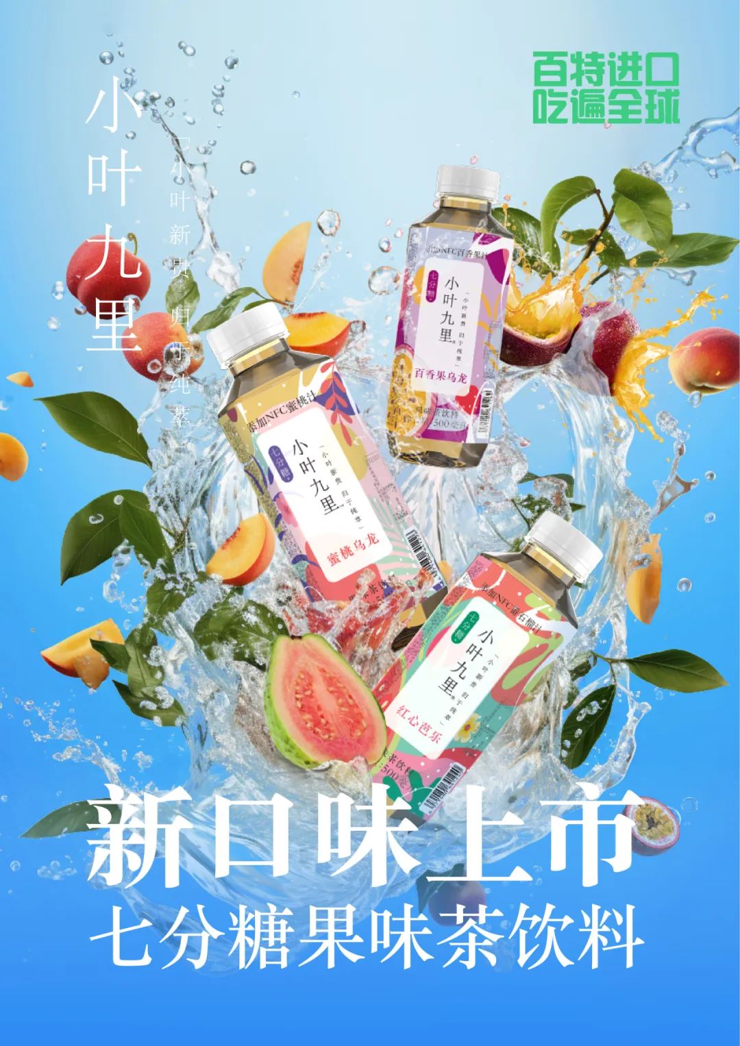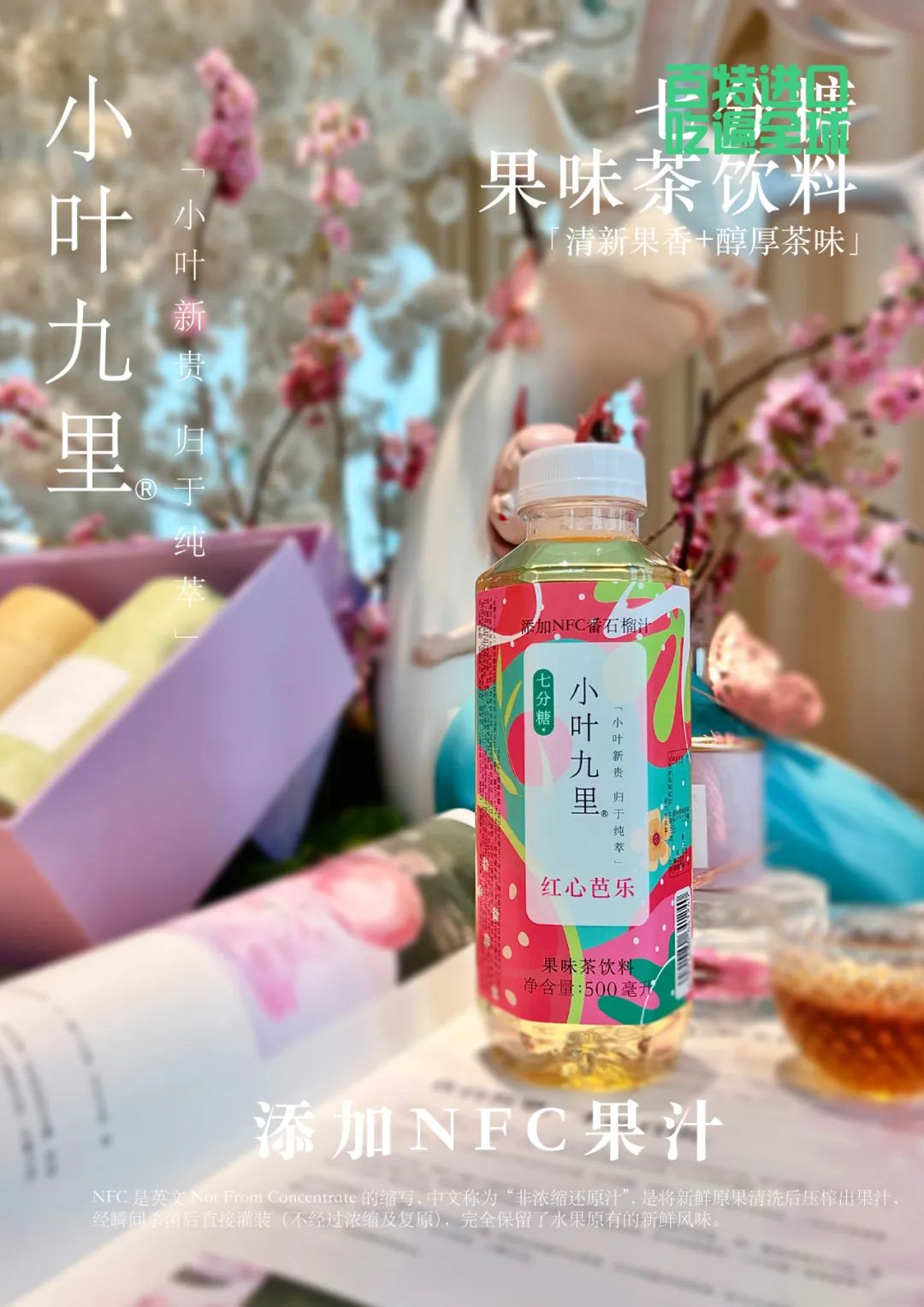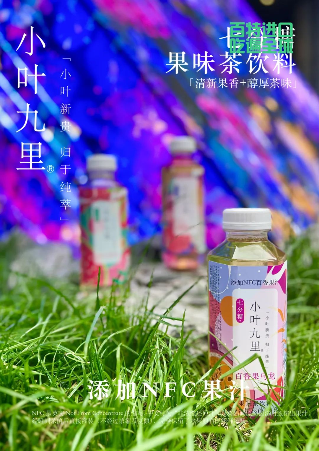 独特东方气韵茶香~专而注,谦而润,小而美,小叶九里是市场上首款添加100%NFC果汁的果汁茶,添加百分百NFC,清甜润口,茶香浓郁,真果汁与原茶萃取,碰撞出的美妙的复合果香,自然果香融入丰盈茶香,细腻入微,层层递进,自然鲜爽!低糖调味,更好喝更健康!