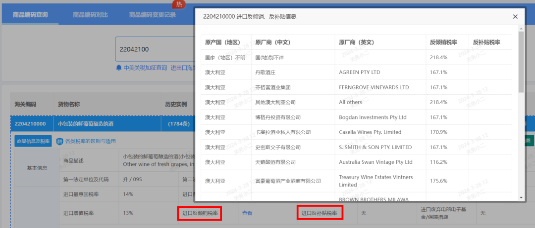 2021年3月26日,商务部发布2021年第6号和第7号公告,决定对原产于澳大利亚的进口相关葡萄酒征收反倾销税,为避免双重征税,不征收反补贴税。反倾销税实施期限自2021年3月28日起5年(关务小二注:该产品归在《中华人民共和国进出口税则》:22042100)。