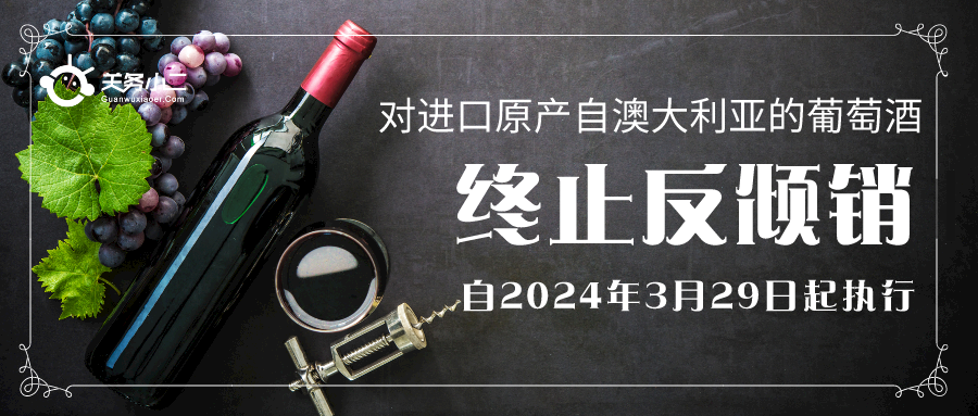 根据《中华人民共和国反倾销条例》第五十条和《中华人民共和国反补贴条例》第四十九条的规定,商务部向国务院关税税则委员会提出取消反倾销税和反补贴税的建议,国务院关税税则委员会根据商务部的建议作出决定,自2024年3月29日起,终止对原产于澳大利亚的进口相关葡萄酒征收反倾销税;终止征收反倾销税后,不征收反补贴税。