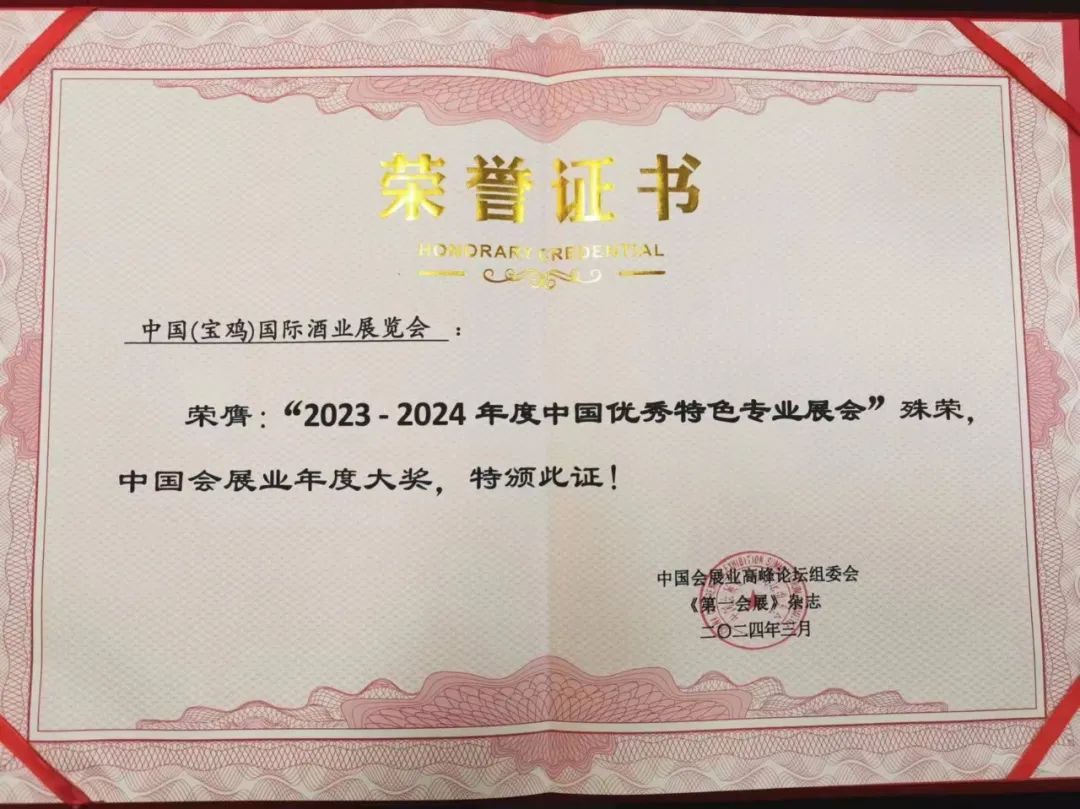 3月26-27日,2024中国国际会展业创新发展大会(CCESF)春季峰会在上海青浦区盛大举行。大会上,由中国国际商会主办、中国国际贸易促进委员会宝鸡市支会承办、贵州国际酒类博览会股份有限公司运营的“中国(宝鸡)国际酒业展览会”获得“2023—2024年度中国优秀特色专业展会”殊荣。