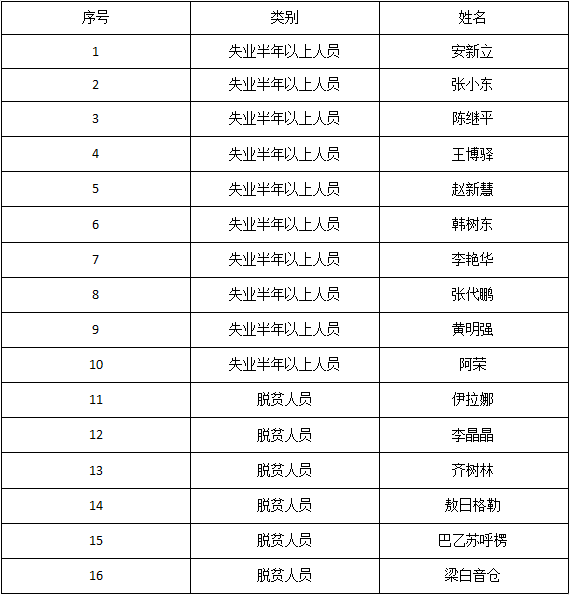 根据《财政部税务总局 人力资源社会保障部 国务院扶贫办关于进一步支持和促进重点群体创业就业有关税收政策的通知》财税〔2019〕22号文件要求,锡林浩特市就业服务中心积极推进企业吸纳重点群体就业工作,经审核,锡林浩特市优然牧业有限责任公司吸纳16名重点群体就业符合申请企业吸纳重点群体就业认定条件,现予以公示,公示名单如下,如有异议,请拨打监督举报电话:0479—8224992。