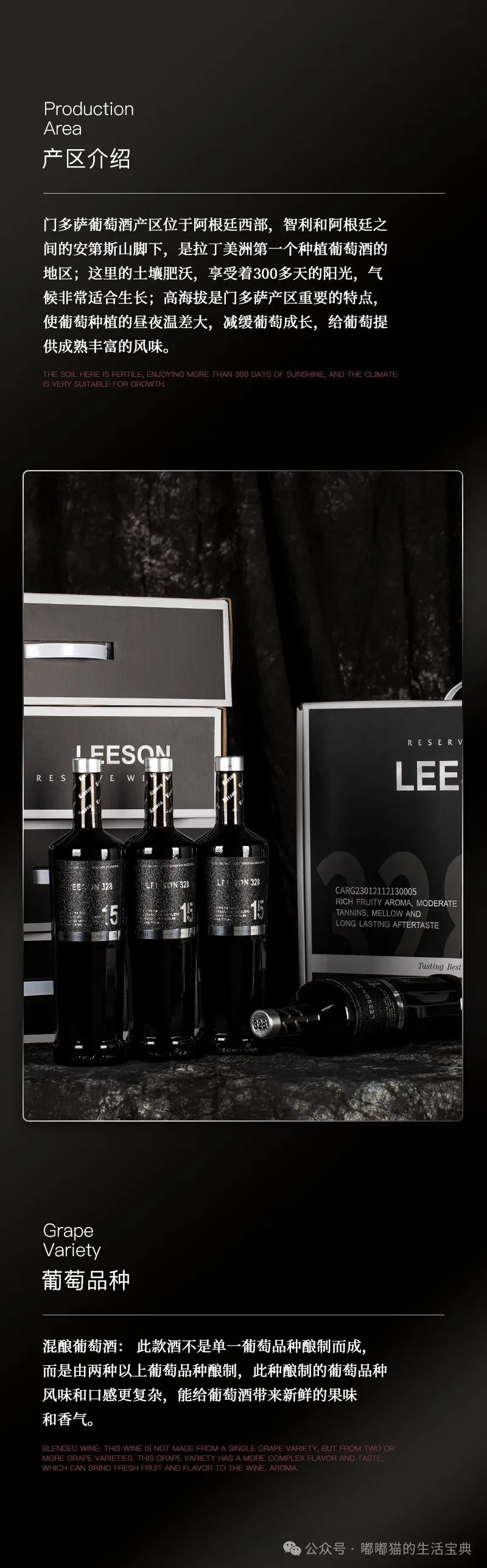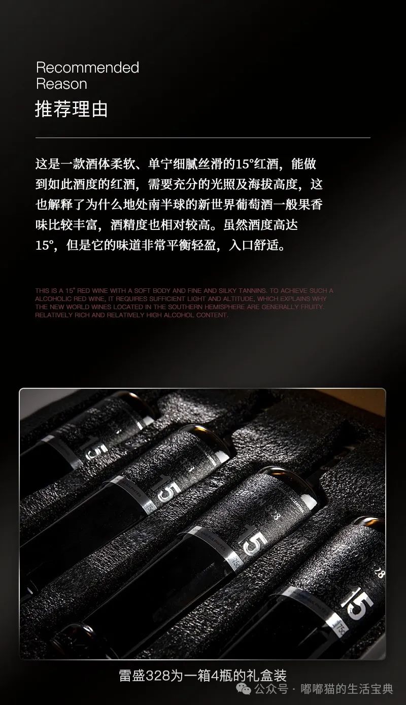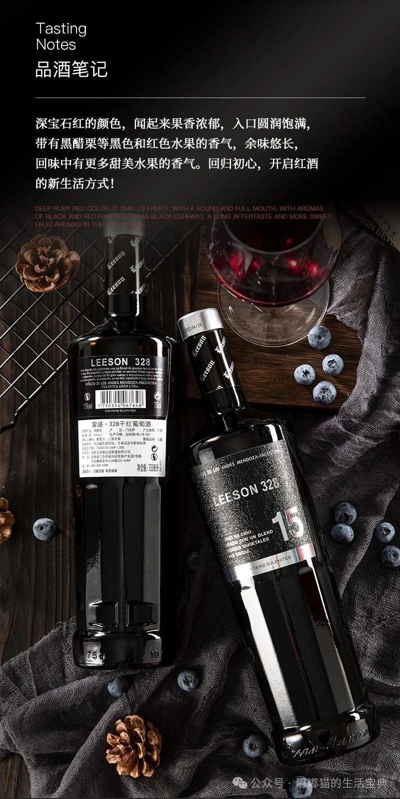 雷盛328干红葡萄酒正是来自阿根廷著名门多萨产区由优质马尔贝克酿造,以深邃的颜色和水果炸弹式的香气而闻名,散发着樱桃、草莓、李子、葡萄干和黑胡椒的香气,有时还会伴有炖熟水果的气息,口感精致平衡,单宁丝滑,富有活力。