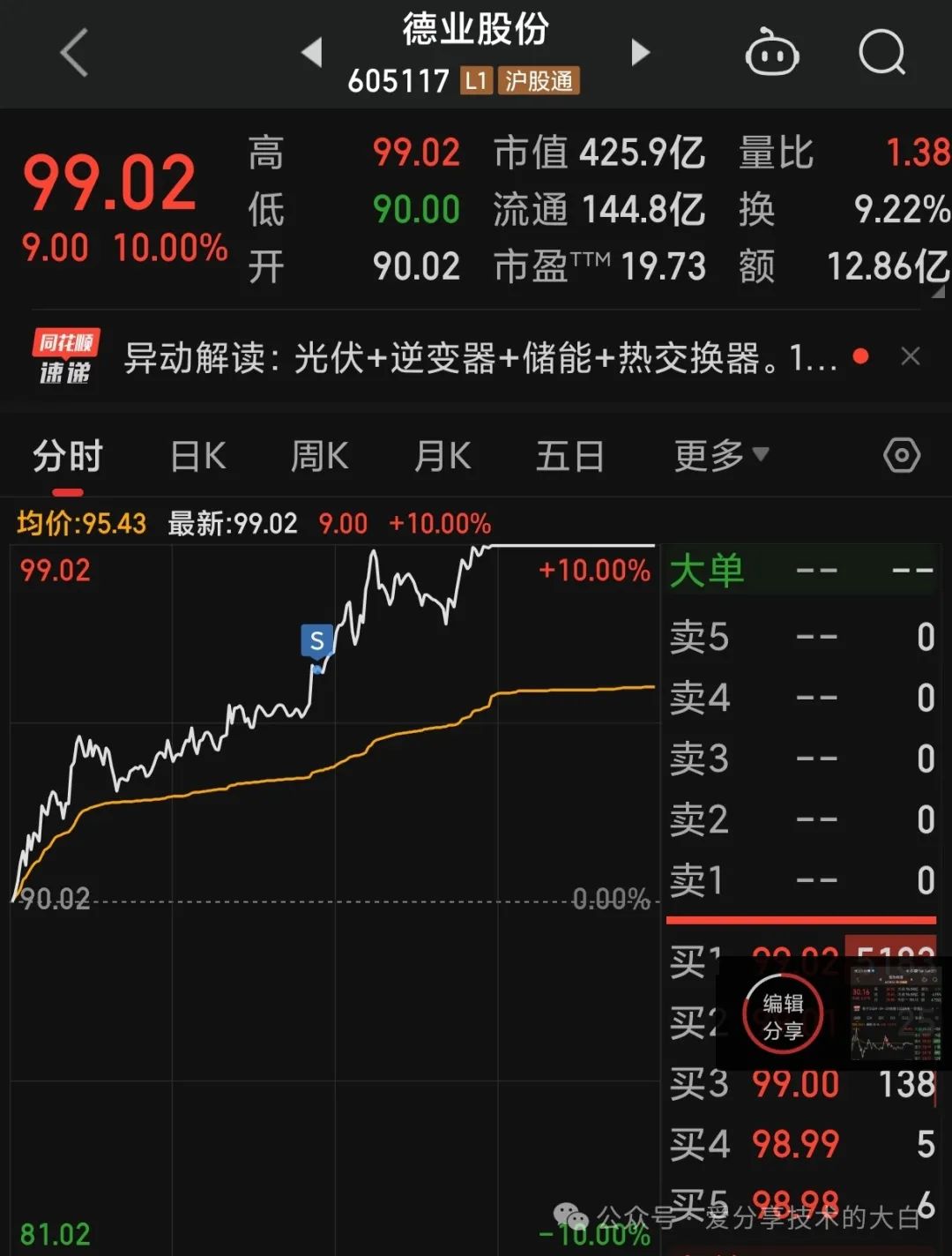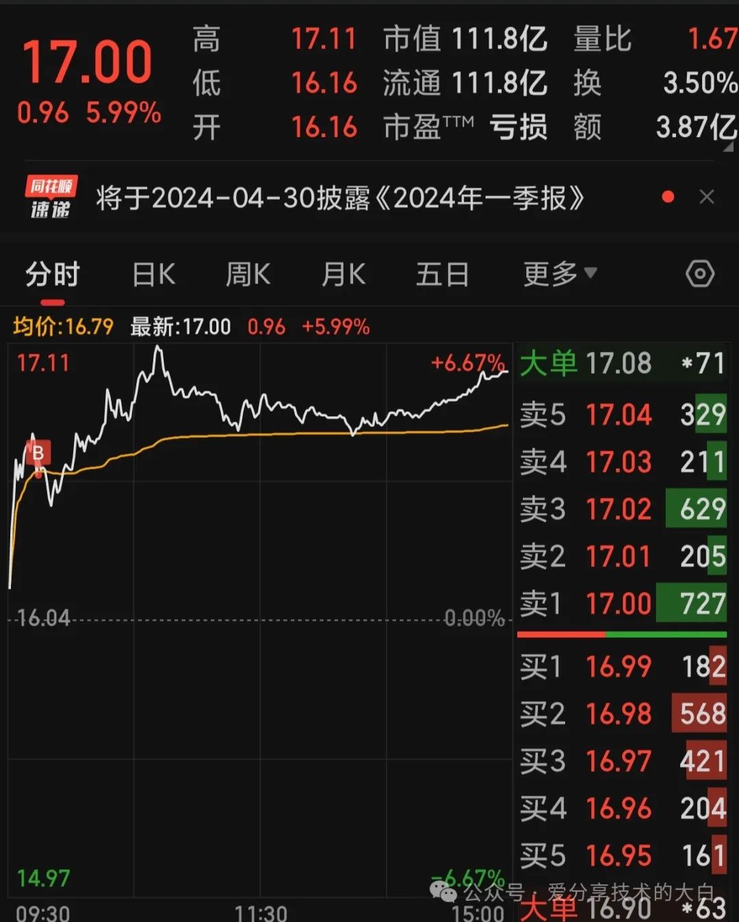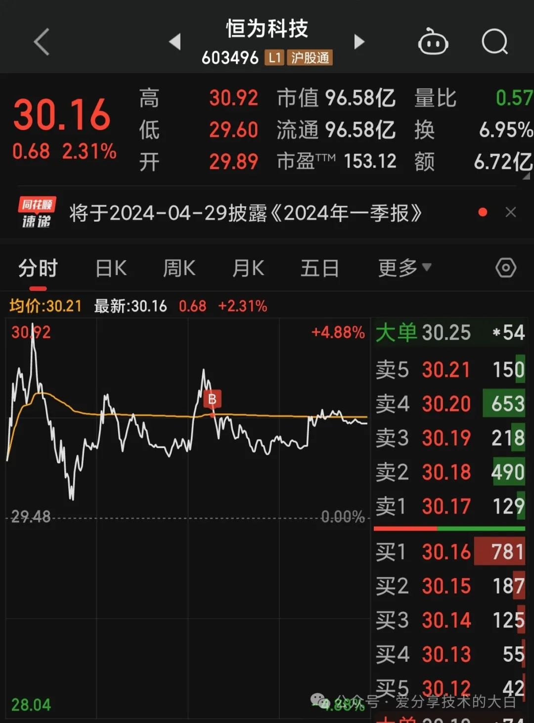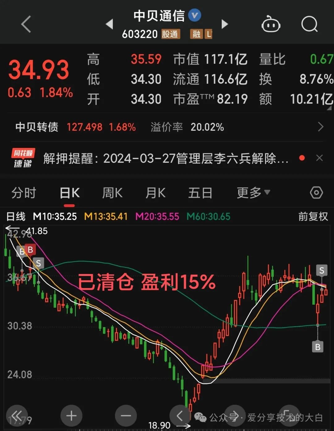 1.知行合一,上周主要给大家的复盘跟踪的算力板块,中贝通信周四跌停板抄底,周五高点出局,两天盈利接近15%(短线清仓)2.今天再次进场算力,目前第二次做恒为科技(当然这个位置是反弹诱多还是主力借上周利空砸盘再次拉升,我个人比较看好后者),算力板块大家密切关注中贝通信/恒为科技/莲花健康/鸿博股份....3.之前给大家说的新能源板块里头我认为走势最好的就是德业股份,今天涨停,短期减仓,决定做中长线波段4.金种子,今天白酒强势止跌信号,非常关键,盘中轻微加仓,目前拿了接近两周,亏损2%今天因为周末利好消息普涨行情,量价齐升非常健康,白酒/汽车/人工智能/新能源等都是大涨,其中我个人比较看好的还是人工智能板块1.白酒板块强势止跌,是一个比较好的信号,目前资金已经开始进入四月底一季报行情,这里有明显预期,但是大白也之前给大家说过白酒茅五泸汾明显压力位,高抛低吸始终没错2.汽车板块今天出现大阳线反包,上周五因为小米汽车的事件包括美股汽车都是大跌,今天能够出现反包确实严重超预期,江淮/比亚迪/长安/长城/东风等等都在20均线止跌并且反包这里明显是强势信号,这里可以关注一下如果出现回调都是机会。3.新能源板块整体的套牢盘就是今年年初国家队抄底护盘被套的资金,目前很多优秀品种也很快到了重要的严重套牢区,这个位置建议逢高减仓,因为持续性需要进一步关注。
