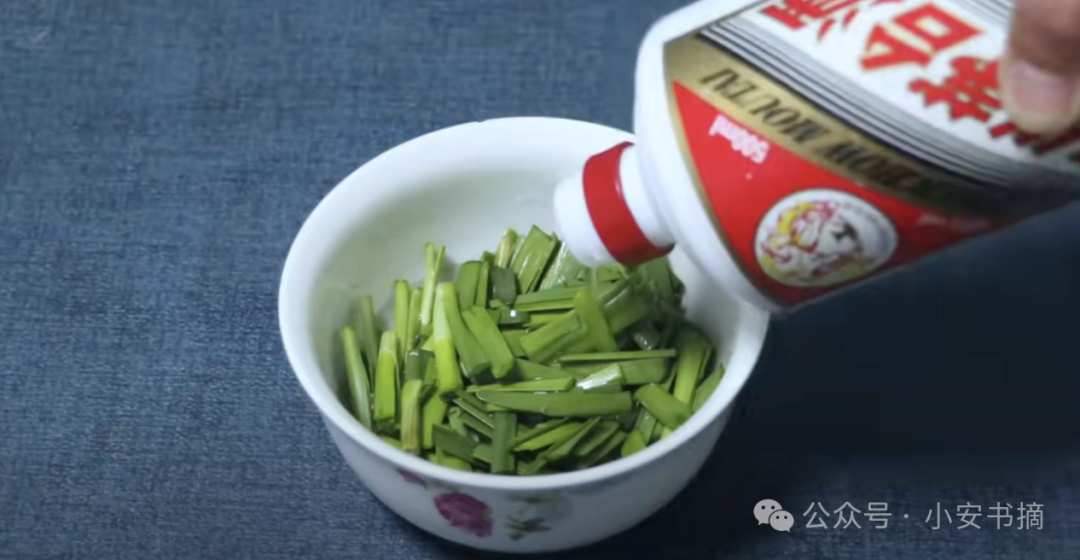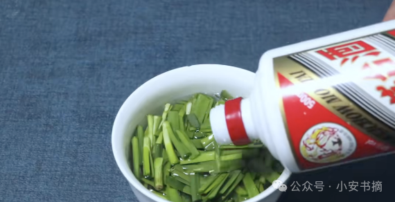 接下来的步骤非常关键。我们再准备一瓶白酒,一定要选择53度以上的白酒。高度白酒可以更好地提取韭菜中的有效成分。将白酒倒入韭菜中,直到全部覆盖韭菜。然后,使用筷子把韭菜和白酒均匀地融合在一起,搅拌均匀。