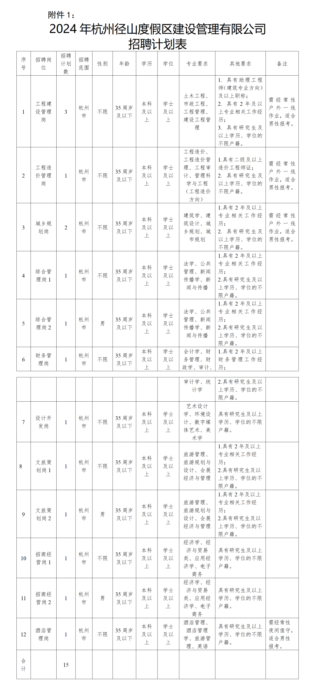 杭州径山度假区建设管理有限公司计划招聘工作人员15名。具体招聘岗位、人数及条件详见《2024年杭州径山度假区建设管理有限公司招聘计划表》(附件1)。