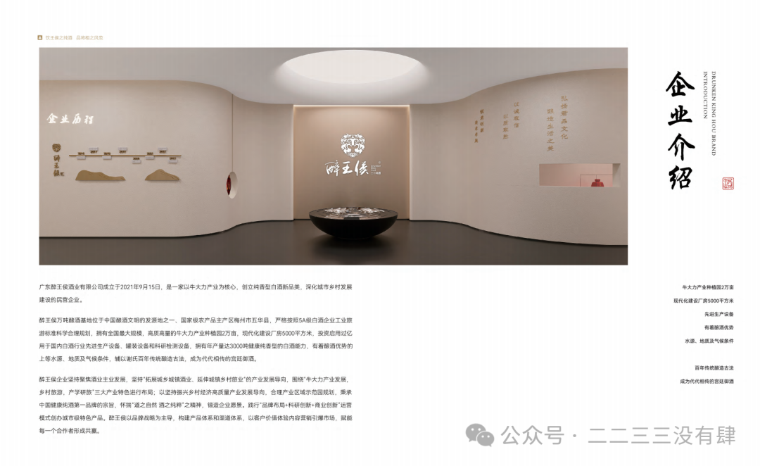 广东醉王侯酒业有限公司成立于2021年9月15日,是一家以牛大力产业为核心,创立纯香型健康白酒新品类,深化城市乡村发展建设和践行百千万工程的民营企业。醉王侯万吨酿酒基地位于中国酿酒文明发源地之一、国家级农产品主产区梅州市五华县。公司严格按照5A级白酒企业工业旅游标准,科学合理规划建设,拥有高质量牛大力种植基地2万余亩,现代化厂房5000多平方,先进的生产设备、灌装设备、检测及研发设备齐全。具有年产纯香型健康白酒3000吨的能力,最高年产量可达万吨。醉王侯酒享有优质的水源、地理环境及气候条件,辅以谢氏百年传承古法酿酒技艺,酿制现代酒类新品类。详细介绍