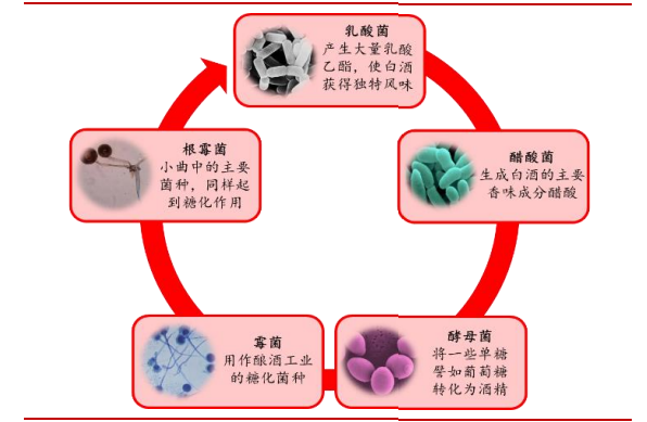 白酒酿造过程即为大分子物质分解再合成的过程,该过程中霉菌微生物的霉系起到关键的作用。霉菌微生物在白酒酿造过程中,不仅可以为其提供重要的酶系,而且还可以通过自身代谢生成部分重要香味物质的前提物质。
