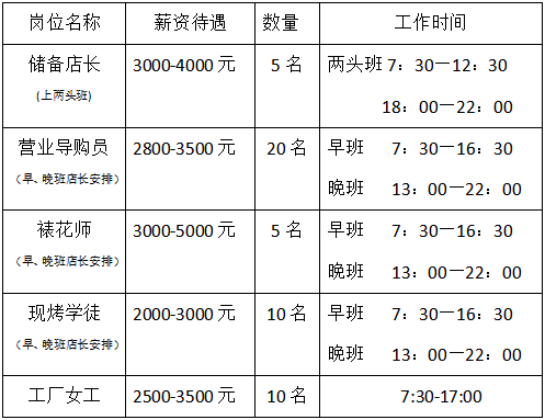 陕西安康花旗食品有限公司于2011年08月19日成立。公司经营范围包括:糕点(烘烤类、油炸类、蒸煮类、月饼)加工、销售;预包装食品、乳制品(不含婴幼儿配方奶粉)、日用百货、土特产销售;饮品制售;电子商务等。现因业务发展需要,诚聘以下岗位人员: