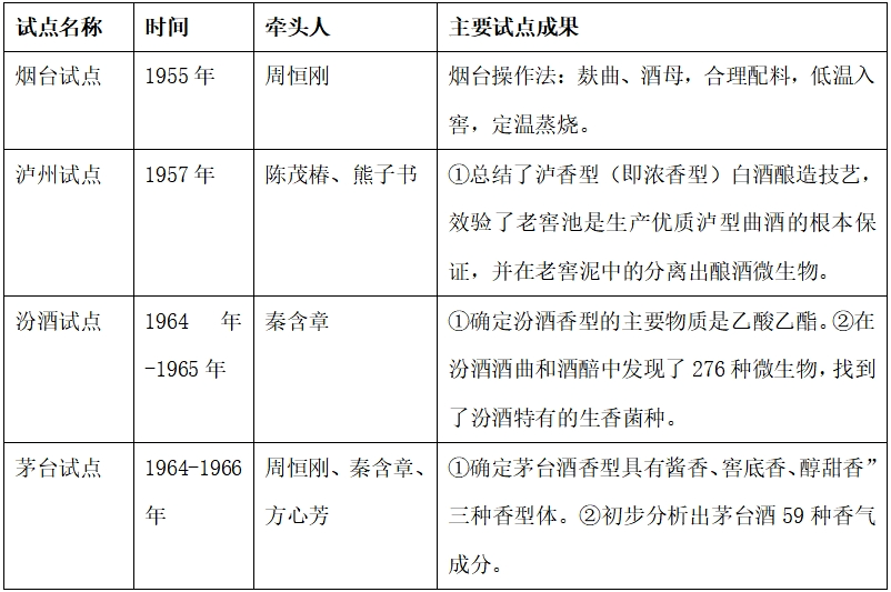 此时,为了振兴中国酿酒工业,周恩来总理亲自倡导了中国白酒试点的项目,并派出秦含章、周恒刚、方心芳、熊子书等老一代专家,在全国进行了四次大的“技术试点”工作,即烟台试点、泸州试点、汾酒试点和茅台试点,让中国白酒的酿造逐渐发展成一门精确的、定量的、深入到分子层次的学科门类。