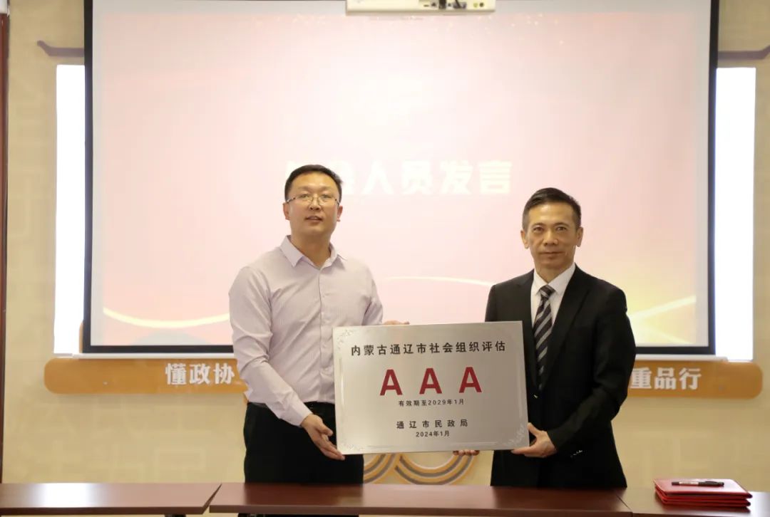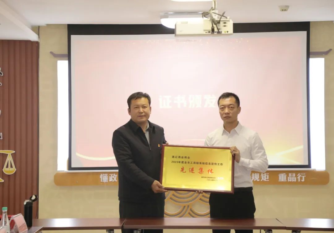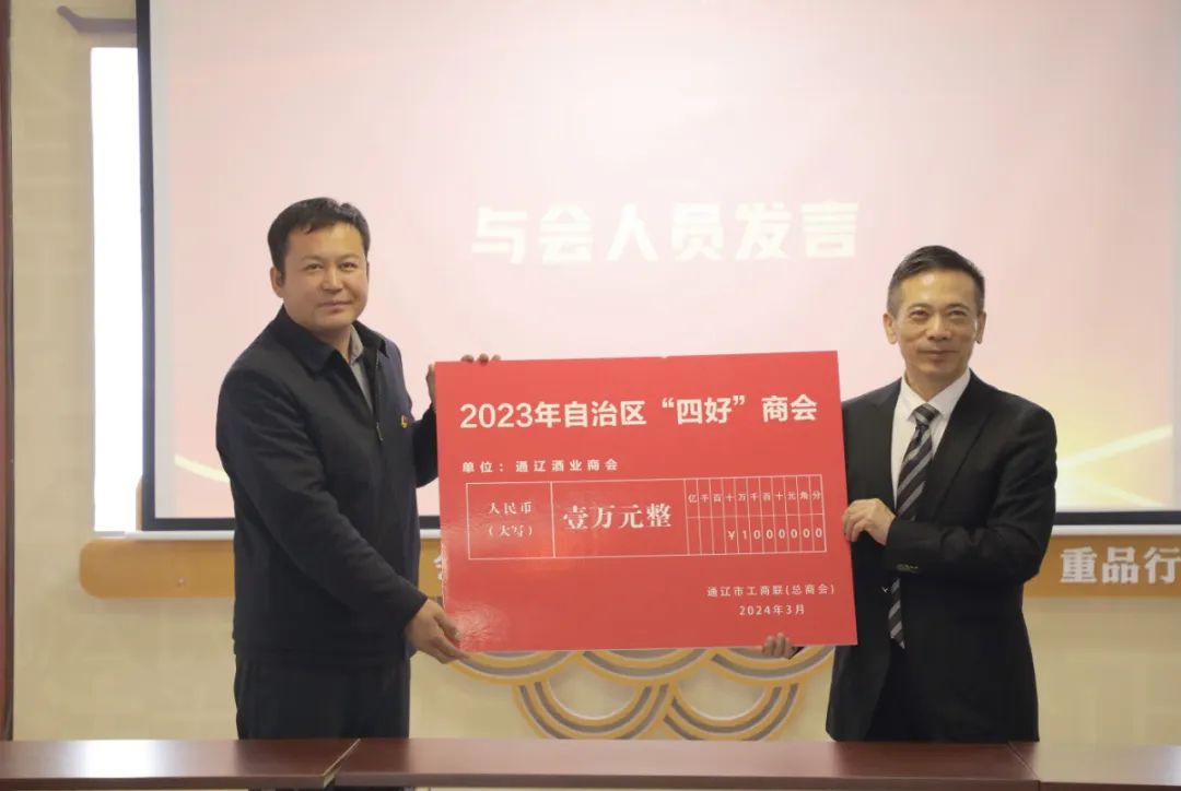 会上,通辽市工商联经联部部长赵瑞为商会颁发2023年自治区“四好”商会荣誉和2023年度全市工商联系统信息宣传工作先进集体荣誉牌匾,通辽市民政局社会管理局负责人蔡井峰为商会颁发3A级社会组织荣誉牌匾,希望商会不忘初心,积极进取,为通辽市民营经济发展和通辽酒行业市场健康发展做出更大贡献。