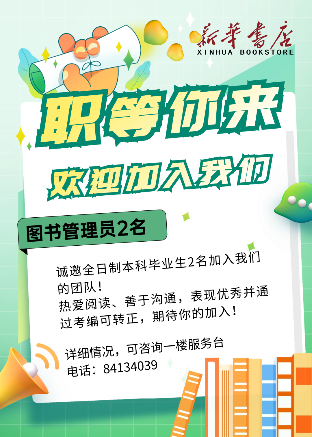 浙江柯桥新华书店有限公司因事业发展需要,现面向社会公开诚聘图书管理员2名,如果您热爱图书事业,具备岗位所需的专业知识,有良好的团队协作精神,创新的工作理念、负责的工作态度以及健康的体魄,欢迎您报名应聘。