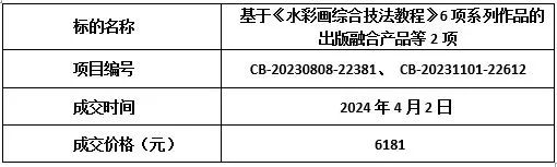 受广东岭南美术出版社有限公司委托,下列出版融合产品在武汉知识产权交易所成功交易,成交项目2项,成交总金额6181元。