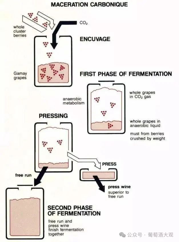 2、二氧化碳浸渍法:这种浸渍法生产的葡萄酒果味新鲜,口感柔顺易饮,无须醒酒且陈年,所以大部分的葡萄酒特别是红葡萄酒会选用这种浸渍手法,同时必须要用整串完好的葡萄还有发酵的容器内必须充满二氧化碳气体才能进行浸渍;