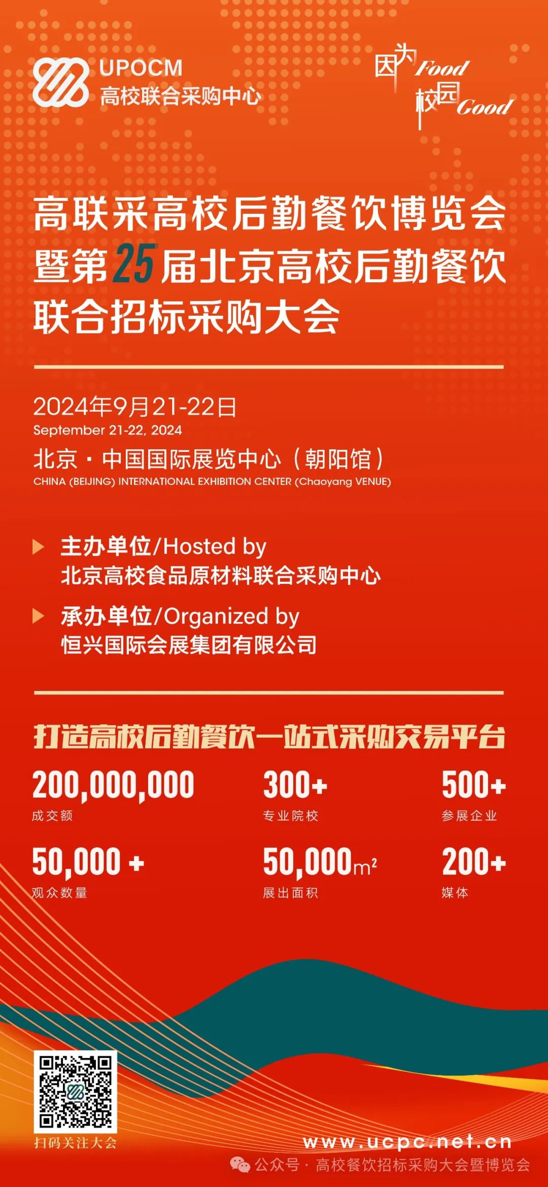 北京高校食品原材料联合采购中心(以下简称:高联采)是于2001年在届时北京高校后勤研究会伙食专业委员会(简称北京伙专会)领导下成立,为北京高校餐饮提供全方位闭环服务解决方案的服务型平台组织;高联采是一个高校自觉联合、行业组织牵头、政府推动支持的公益服务平台。高联采在习近平新时代中国特色社会主义思想指引下,以《中共中央关于教育体制改革的决定》为纲领,以《面向21世纪教育振兴行动计划》为指导方针,以教育部提出的“市场提供服务,学校自主选择,政府宏观调控,行业自律管理,职能部门监督”为后勤餐饮保障发展思路。在各级政府、教育后勤主管部门监督指导下,以“优化成本、食品安全、阳光采购、提能增效、共创师生美好生活”为工作目标。由高联采主办的往届“高校后勤餐饮联合采购大会”在北京市教委的大力支持、北京高校和供应商的通力配合、积极参与下,已先后在清华大学、北京大学、北京理工大学、中国农业大学等高校和其他北京大型场馆成功举办了24届,圆满服务和保障了北京九十余所 高校后勤餐饮伙食原材料的采购工作,成为了北京市高等教育学校(学院)后勤餐饮管理部门历年一定要到会参与、了解行业新产品新趋势信息的盛会。联合采购活动保证了采购质量,降低了采购价格,增加了采购透明度,实现了学校管理服务部门、师生和厂商的三满意。联采大会的形式也得到了国家、省市各级领导部门的关注和认可。为更好的助力高校餐饮行业发展,深度梳理高校餐饮行业的发展痛点,集中展示高校餐饮行业上下游产业链发展趋势,为行业搭建专业、高品质商洽一体的交流对接,专业咨询,金融服务,贸易采购平台。由北京高校食品原材料联合采购中心主办,恒兴国际会展集团有限公司承办的:高联采高校后勤餐饮博览会暨第25届北京高校后勤餐饮联合招标采购大会将于2024年9月21日-22日在中国国际展览中心(朝阳馆)召开。(一)开幕式:拟邀请教育部等相关部委、行业协会、北京高校、地方政府领导致辞。“统储共配的思路与高校物流供应链变革思考”等方面开展会展前闭门论坛★其他政府部门/公共机构/科研院所/大型团餐企业/军需后勤餐饮管理部门领导;★北京及环京高等教育学校(学院)后勤主管副校/后勤和餐饮主管领导/采购和餐厅经理/学校财务/纪委等监管同志;★中央厨房、智慧餐饮电子设备材料制造/生产厂商/业务开发单位;★餐饮食品及相关设备经销商/代理商/采购商/渠道商/零售商;十大展区
