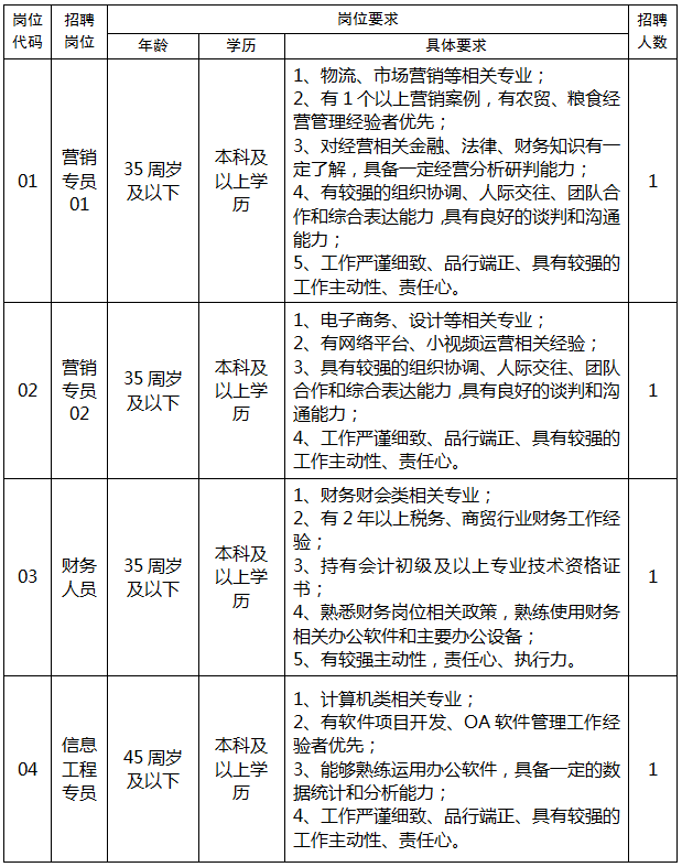江阴粮源粮油集团有限公司成立于2020年12月28日,为市属国有企业,主要负责全市政策性粮食和物资储备、粮油质量检测、资产管理、市场化粮油和农产品流通经销经营等业务。为适应新时代粮食改革发展工作需要,充实粮食管理队伍,改善专业人员结构,现面向社会公开招聘工作人员4名,现将有关事项公告如下: