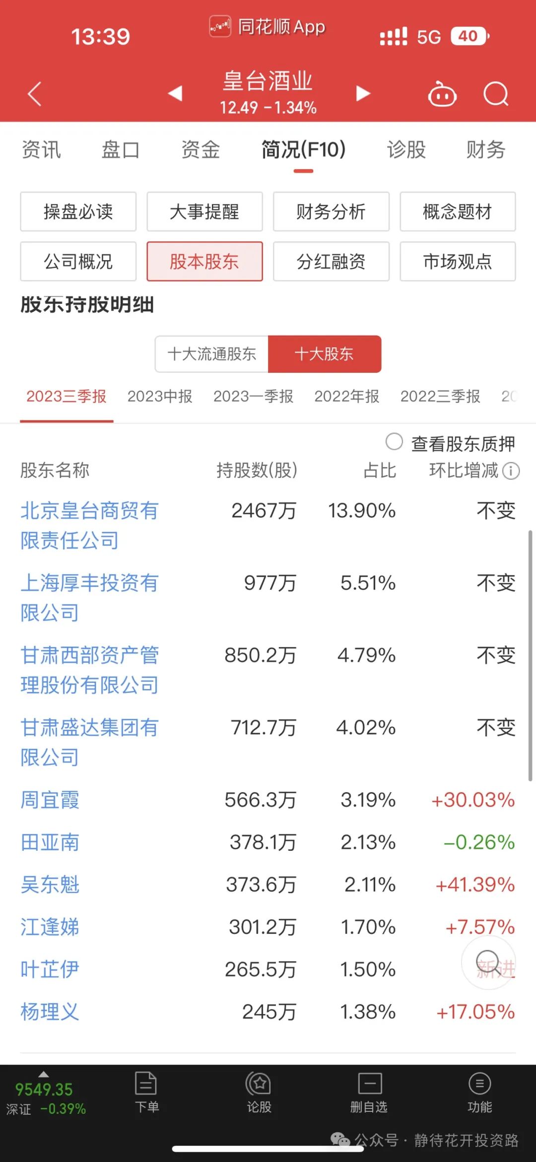 排在第二位的是上海厚丰投资,属于原德隆系。皇台酒业于1月24日晚间发布公告称,公司持股5%以上股东上海厚丰投资有限公司(以下简称“上海厚丰”)所持有皇台酒业的全部股份被轮候冻结。公告显示,截至1月24日,上海厚丰持有皇台酒业股份977万股,占皇台酒业总股本比例为5.51%,其中累计被冻结数量为977万股,占其所持股份比例为100%,占皇台酒业总股本比例为5.51%。