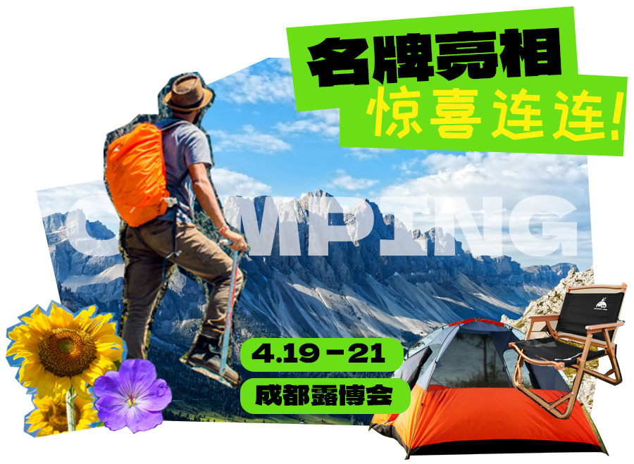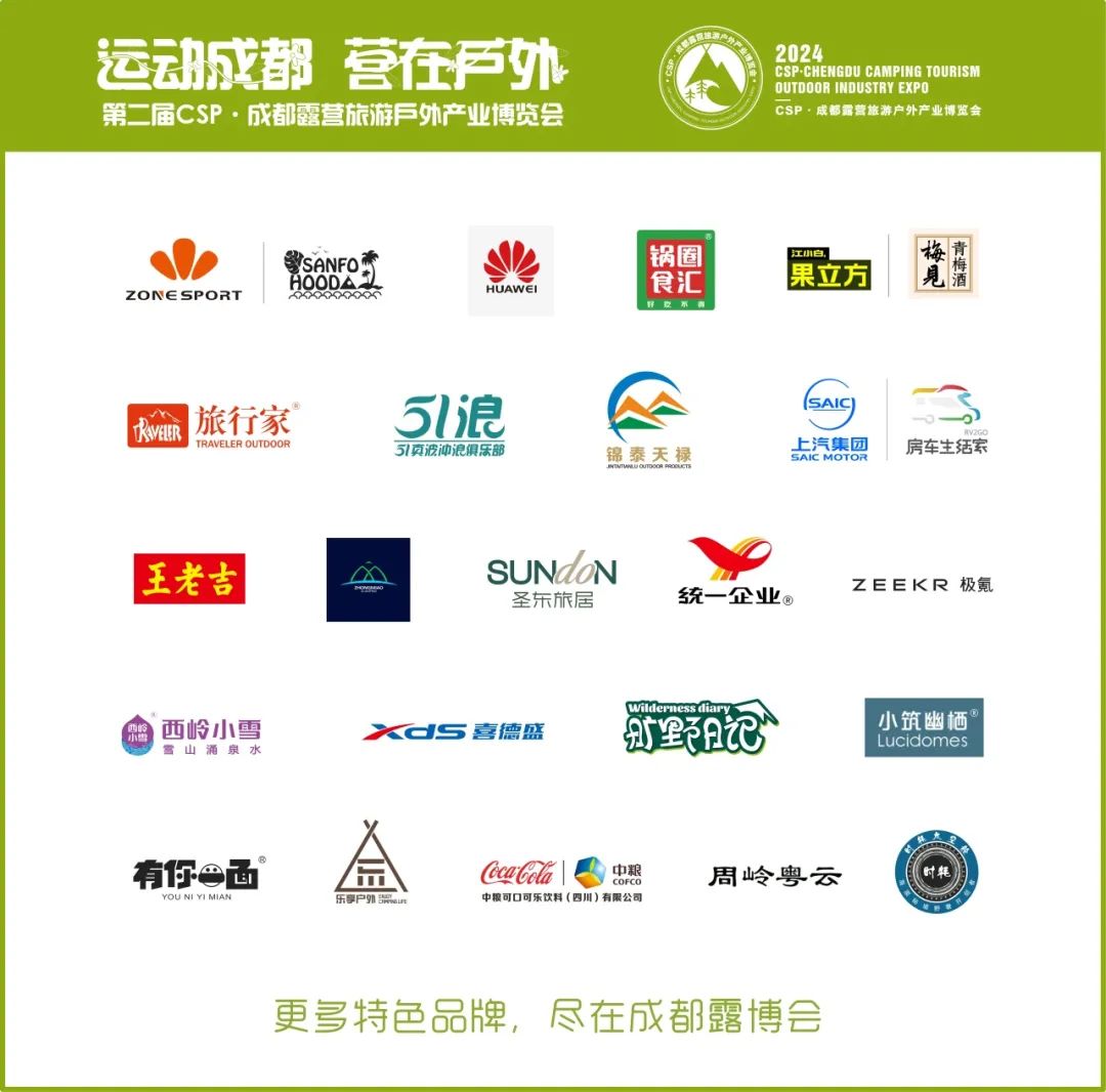 马士格、众妙露营、有你一面、梅见、锅圈食汇、统一集团、王老吉、圣东旅居、可口可乐、华为、西岭小雪、老川东、东莞旅行家、广州雪菊、三夫户外、四川鑫利达、51 浪、喜德盛、上汽大通、浙江沐茜、三胡户外、广东周岭、极氪汽车、星航向、旅行家户外、锦泰天禄、浙江乐享、时牦太空舱、老车迷、成都依耐孚、兴城文投、空港花田、咖茶世家、神獒及四个展出协会……想看更多更多特色品牌,4月19—21日,成都桂溪体育公园,我们在这里等你!